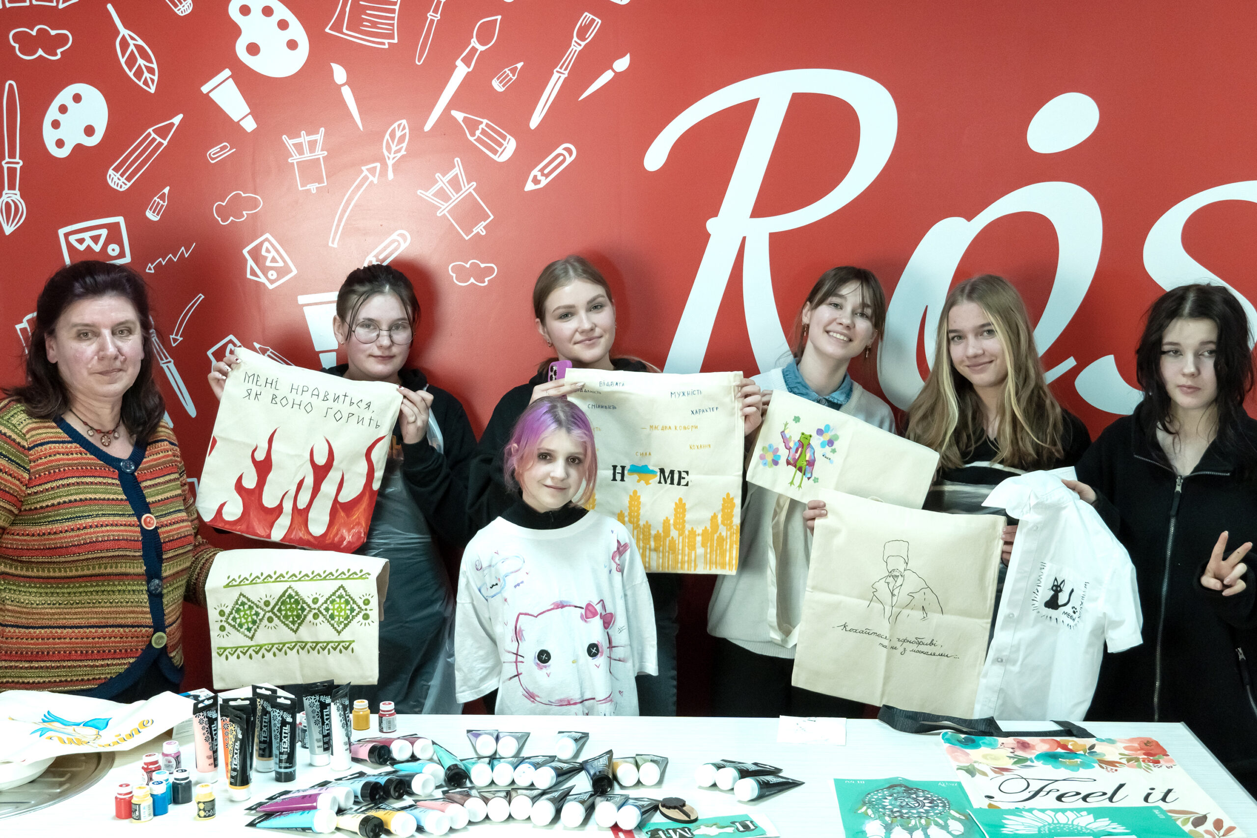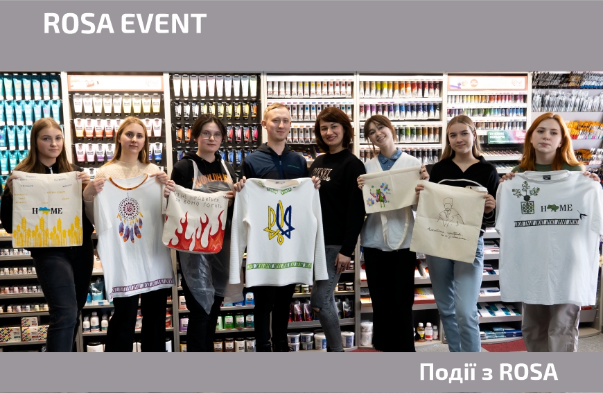 Художники компанії ROSA провели для наших гостей майстер-клас по розпису текстильних виробів. Студенти та викладачі мали можливість протестувати акрил для розпису тканини ROSA Talent, самоклеючі трафарети та нашу новинку для створення візерунків: штампи для вибійки.