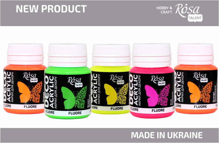 ROSA Talent Decorative Fluorescent Acrylics mixes perfectly with other fluorescent colours as well as with all classic types of acrylic paints. When mixed with matte or glossy colours similar in tone, the brightness of the latter is enhanced. The high concentration of pigment in the paint provides rich, bright, clear colours after application and a high level of fluorescence.