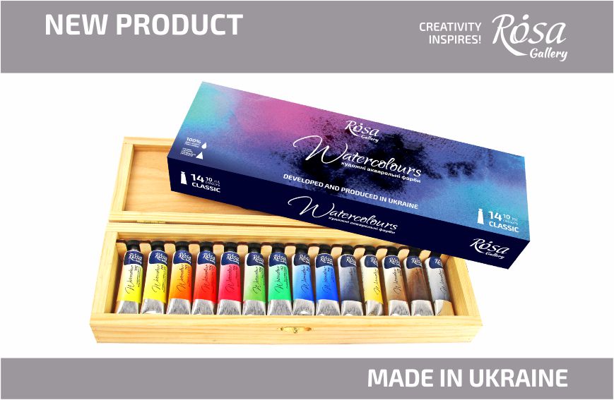We are glad to present a new set of ROSA Gallery CLASSIC watercolours in tubes of 14 colours in a stylish wooden case.