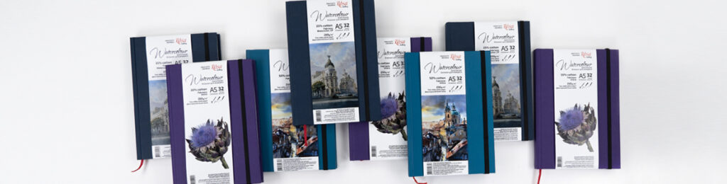 Watercolour sketchbooks with Unica paper (50% cotton, 250 gsm, fine grain) are now available in purple, featuring Daria Pavlenko’s artwork “Art Shoсk”. The cover of the turquoise sketchbook is stylized by a photo of the painting “St. Nicholas’ Cathedral” by a talented Oleksandra Briksa.