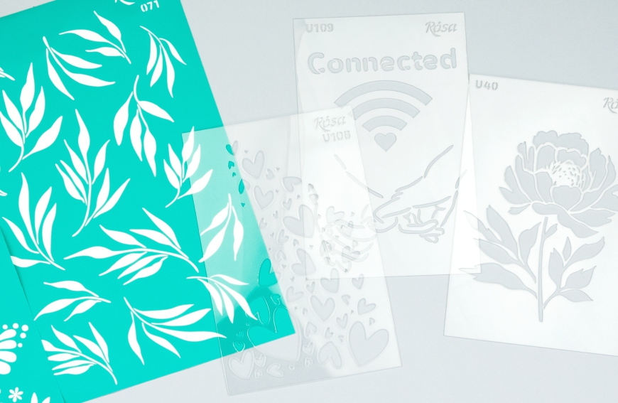 Self-adhesive stencils ROSA Talent are suitable for working with acrylics and gouache paints, spray paints, fabrics paint, glass and ceramic paint, structure pastes, gels, gilding, markers, chalk, wax crayons, and others.