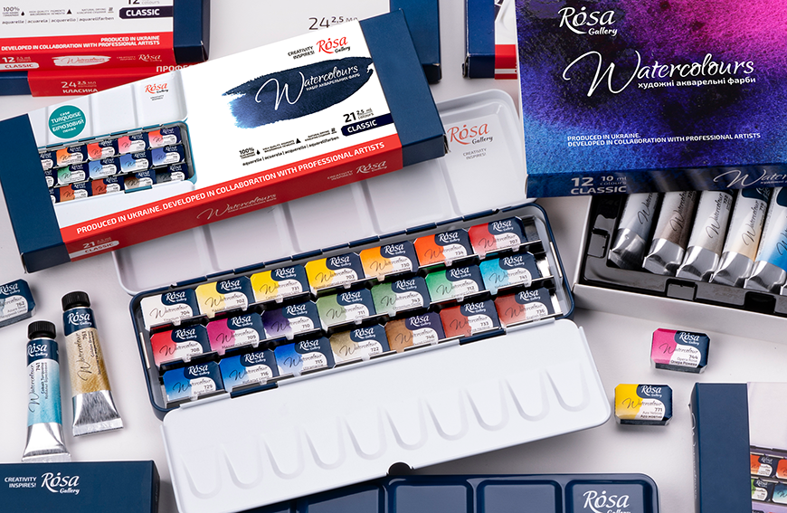 Our peculiar feature is the development of ROSA Paints in collaboration with professional artists. At early stage key features of paints such as сolour palette, transparency and intensity of each colour, paint consistency and easy brushing are defined. Then several laboratory samples of paint are subject to the expert assessment and testing. Consequently, taking artists’ remarks and preferences into consideration, we refine the colour to start its mass production. ROSA Gallery Fine Art Watercolour Paints are designed and produced in Ukraine. High-quality materials, professional approach and modern specialized equipment ensure ultimate quality of our products.