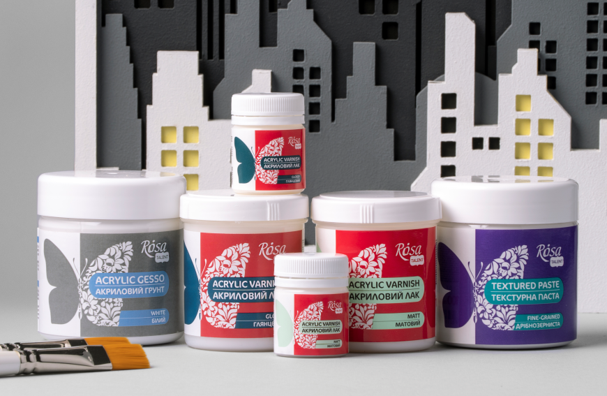 Along with the basic decoration materials, auxiliary materials play an important role and help to prepare the surface for the decorating, create a texture, protect the decorated surface from the influence of external factors. The range of auxiliary materials for decorating ROSA TALENT includes varnishes, primers, pastes and pouring medium for the Fluid Art technique.