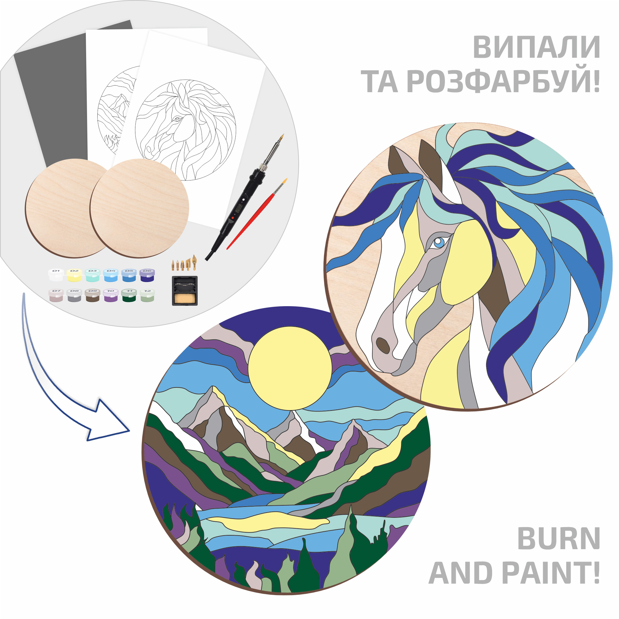 • Image templates for transferring the design to the wooden blanks (2 pcs)
