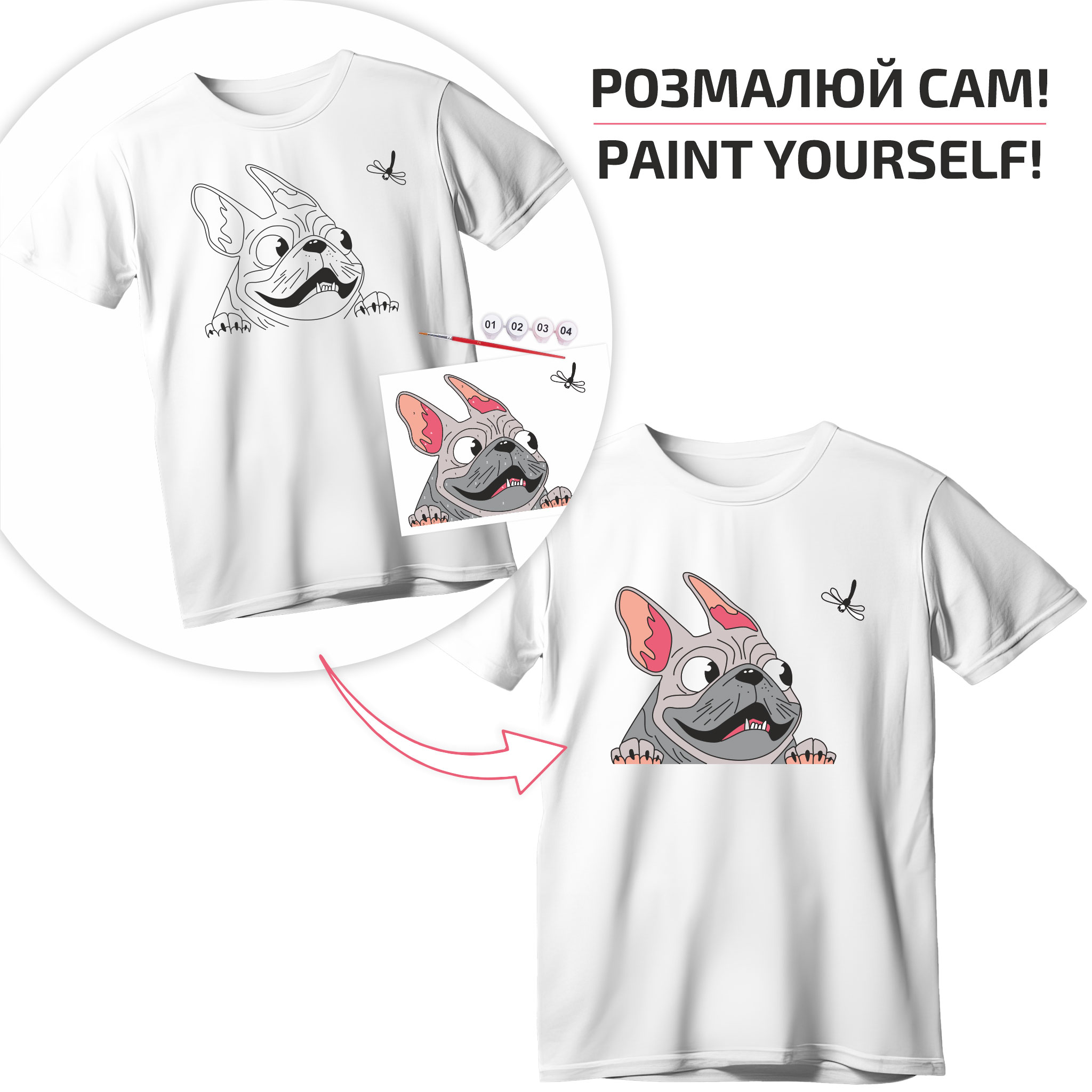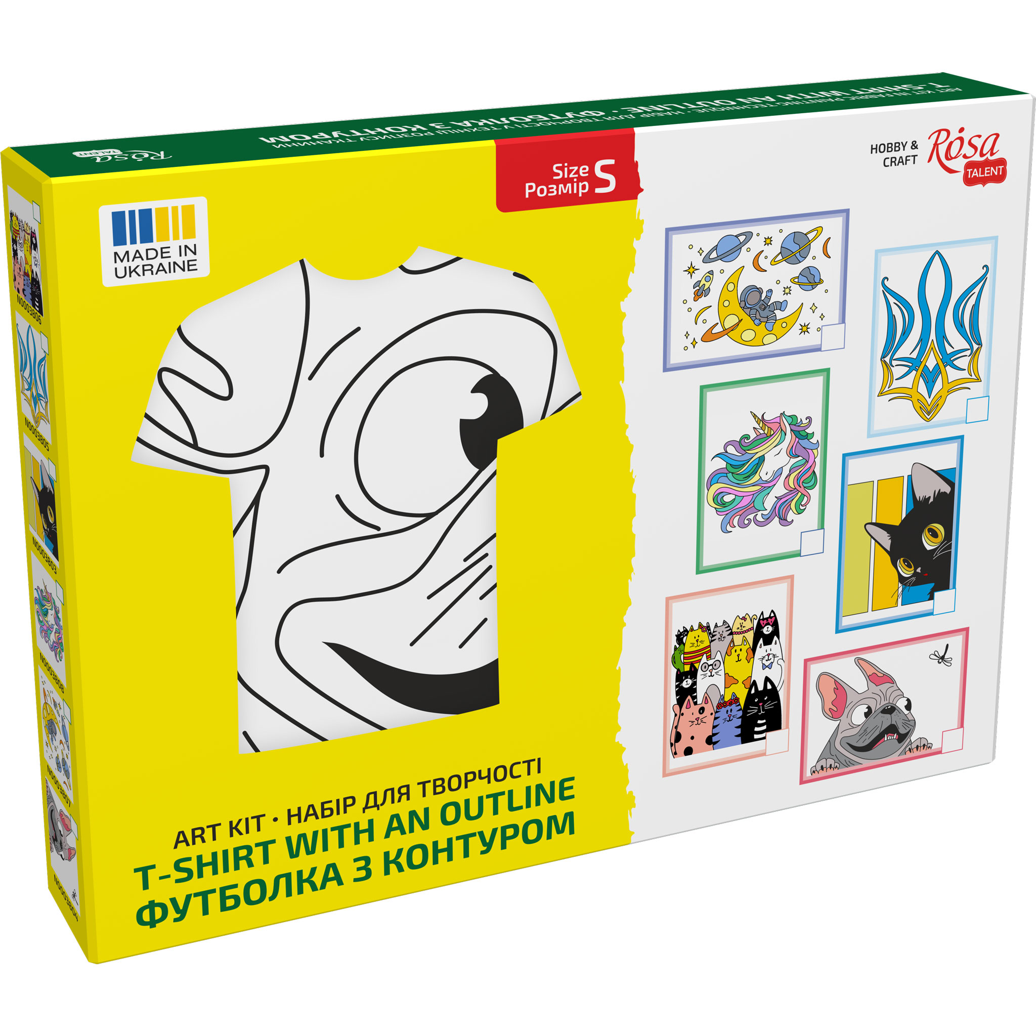 Each kit includes a certain number of colours of special acrylic paints for painting fabric according to the design of the kit and a white ROSA Talent colouring T-shirt made of 100% cotton. With the proper fixing and care, a painted T-shirt can last for years. The painting process is fun and easy, even for children, as the contours of the design are already applied to the T-shirt.