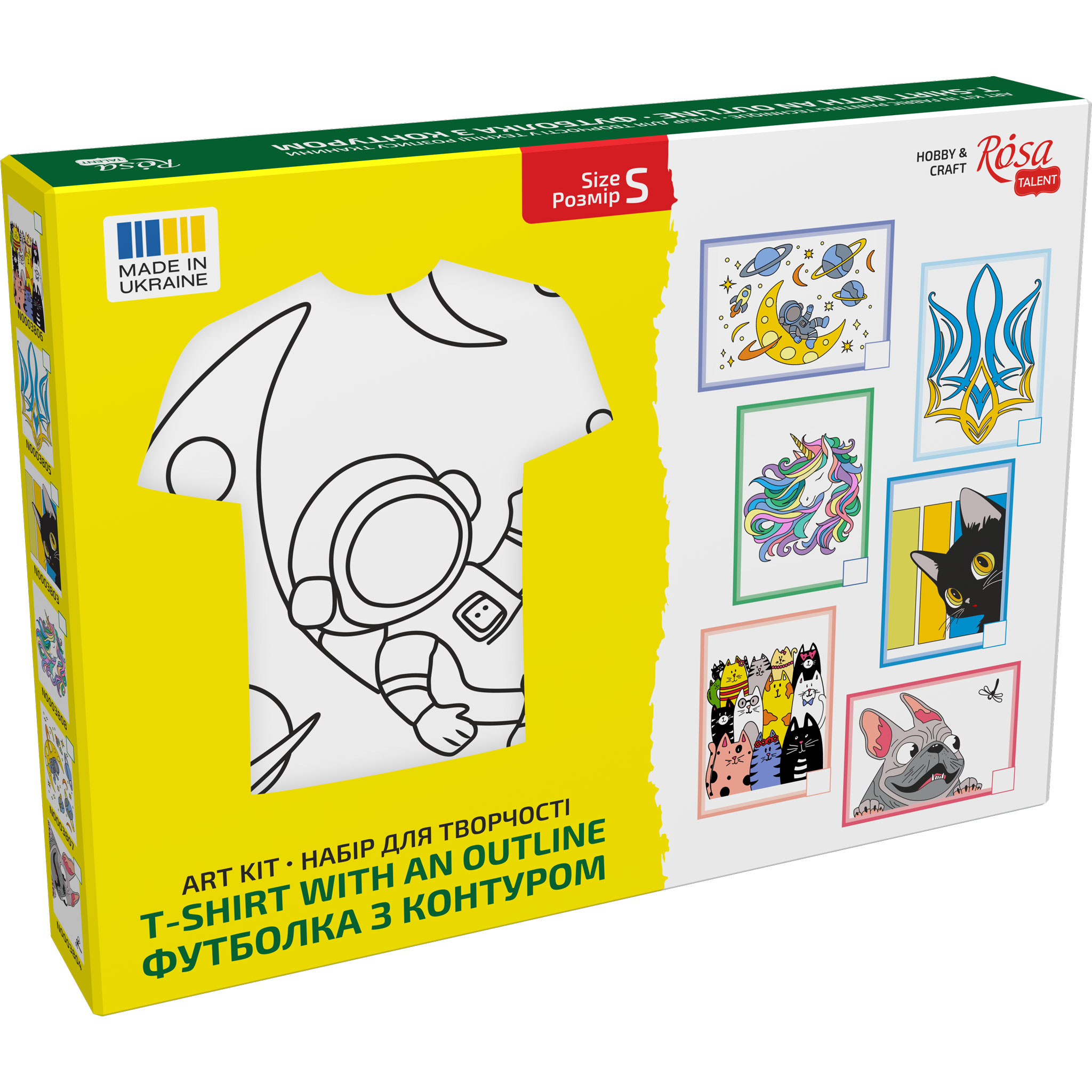 Each kit includes a certain number of colours of special acrylic paints for painting fabric according to the design of the kit and a white ROSA Talent colouring T-shirt made of 100% cotton. With the proper fixing and care, a painted T-shirt can last for years. The painting process is fun and easy, even for children, as the contours of the design are already applied to the T-shirt.