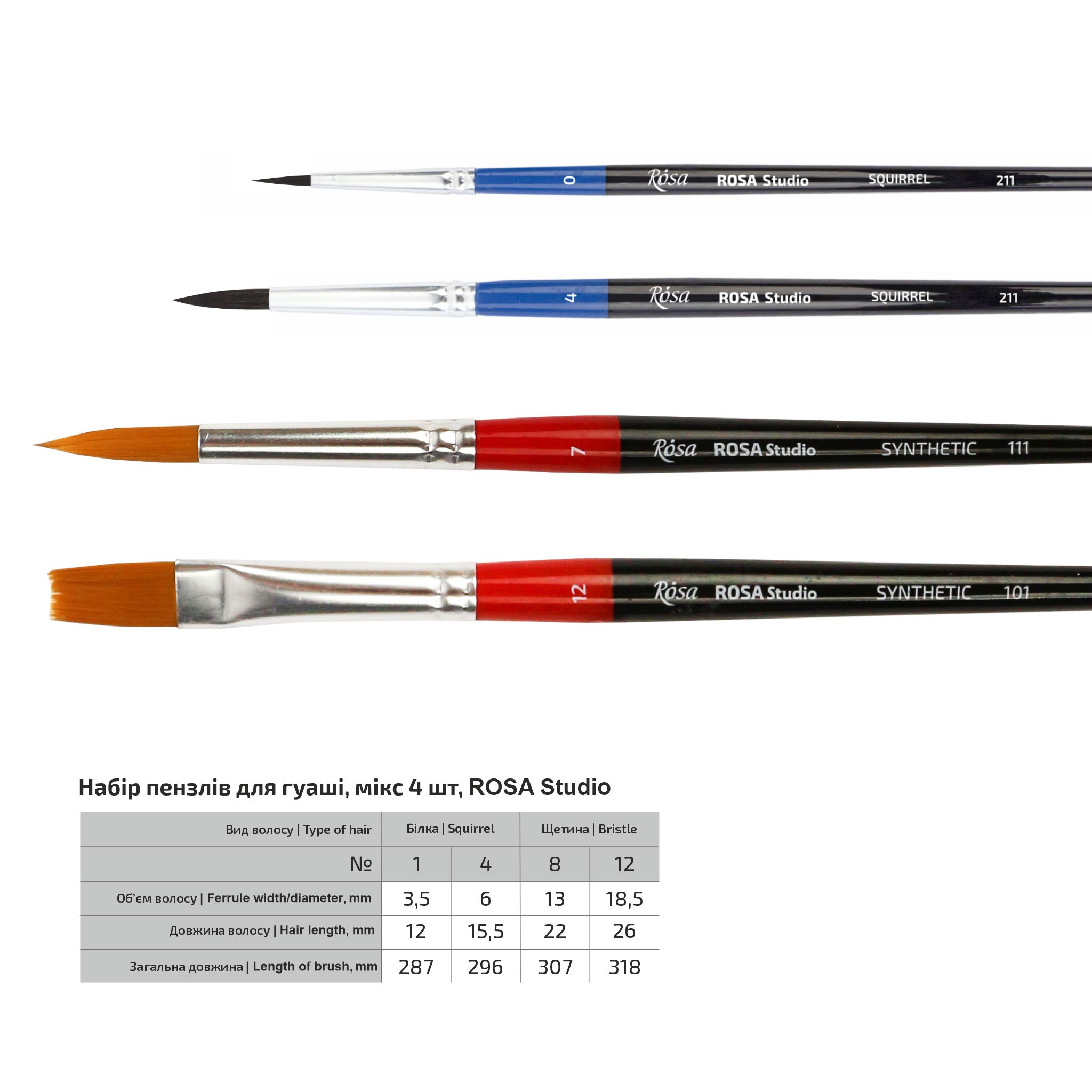 Set of brushes for gouache Mix 4pc Synthetics (№7,12), Squirrel (№0,4) Short Handle ROSA Studio