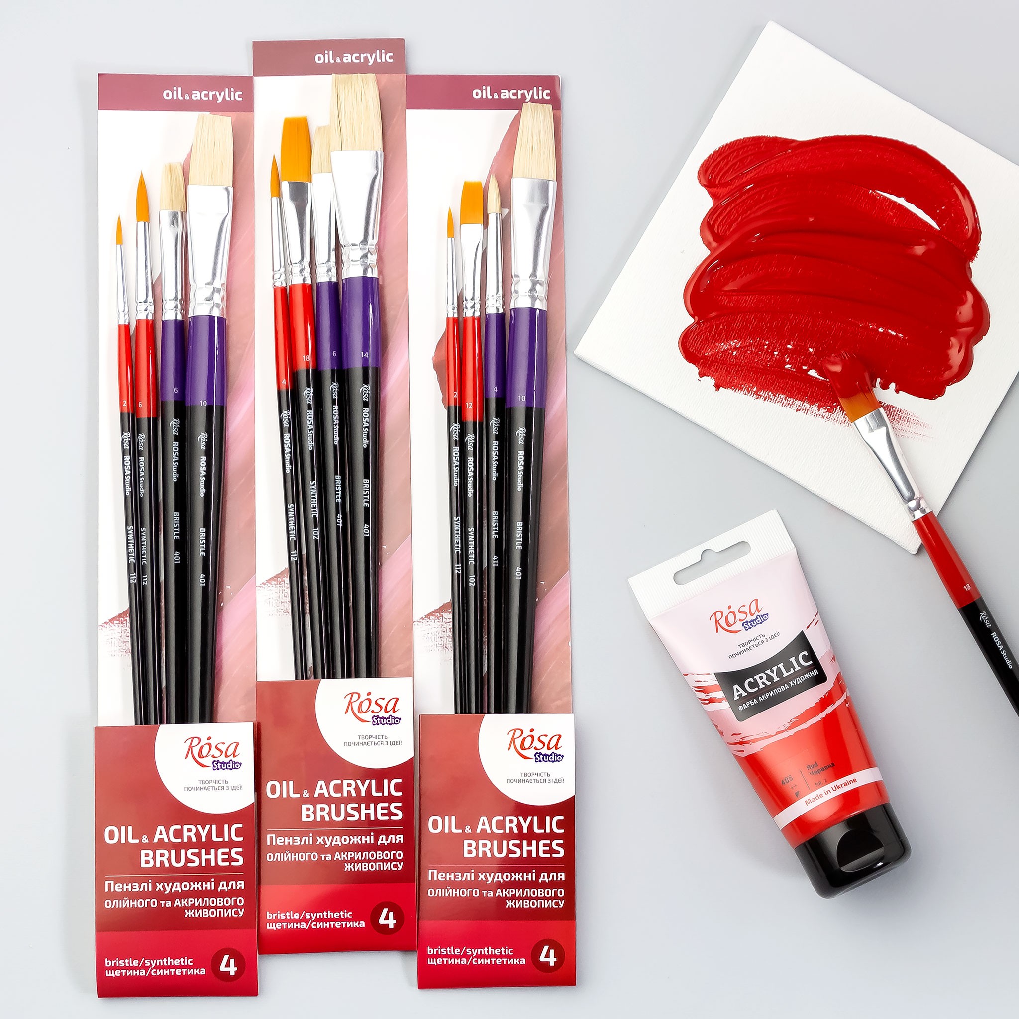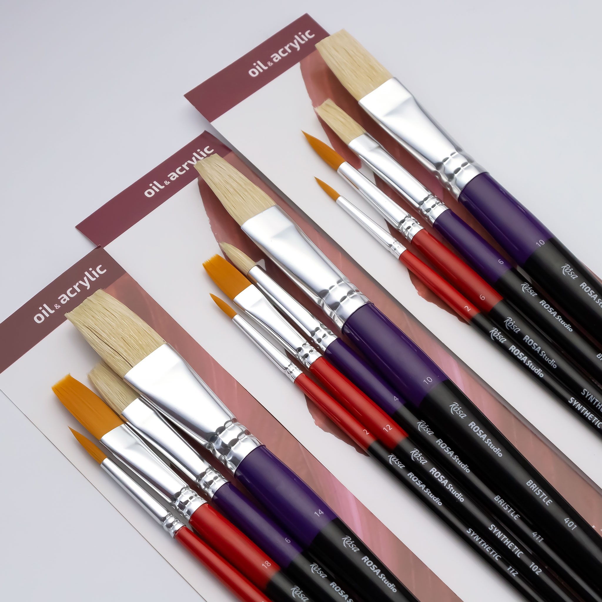 Classic stiff bristles are ideal for textured strokes, and soft elastic synthetics are perfect for smoother strokes or detailing. These characteristics cover various tasks set by the artist and open up new opportunities.