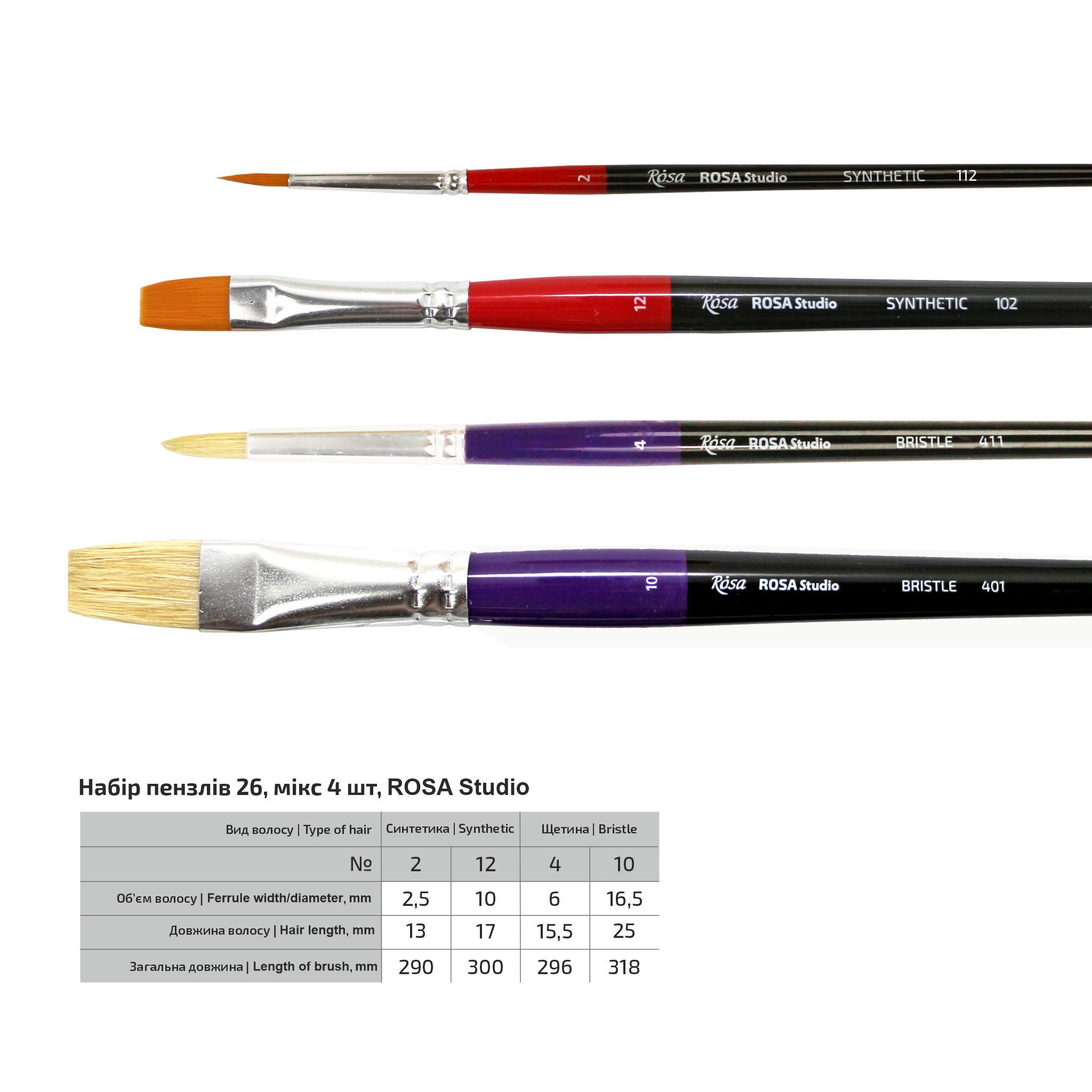 26, mix 4 pcs, synthetic (No. 2 – round, 12 – flat), bristles (No. 4 – round, 10 – flat)
