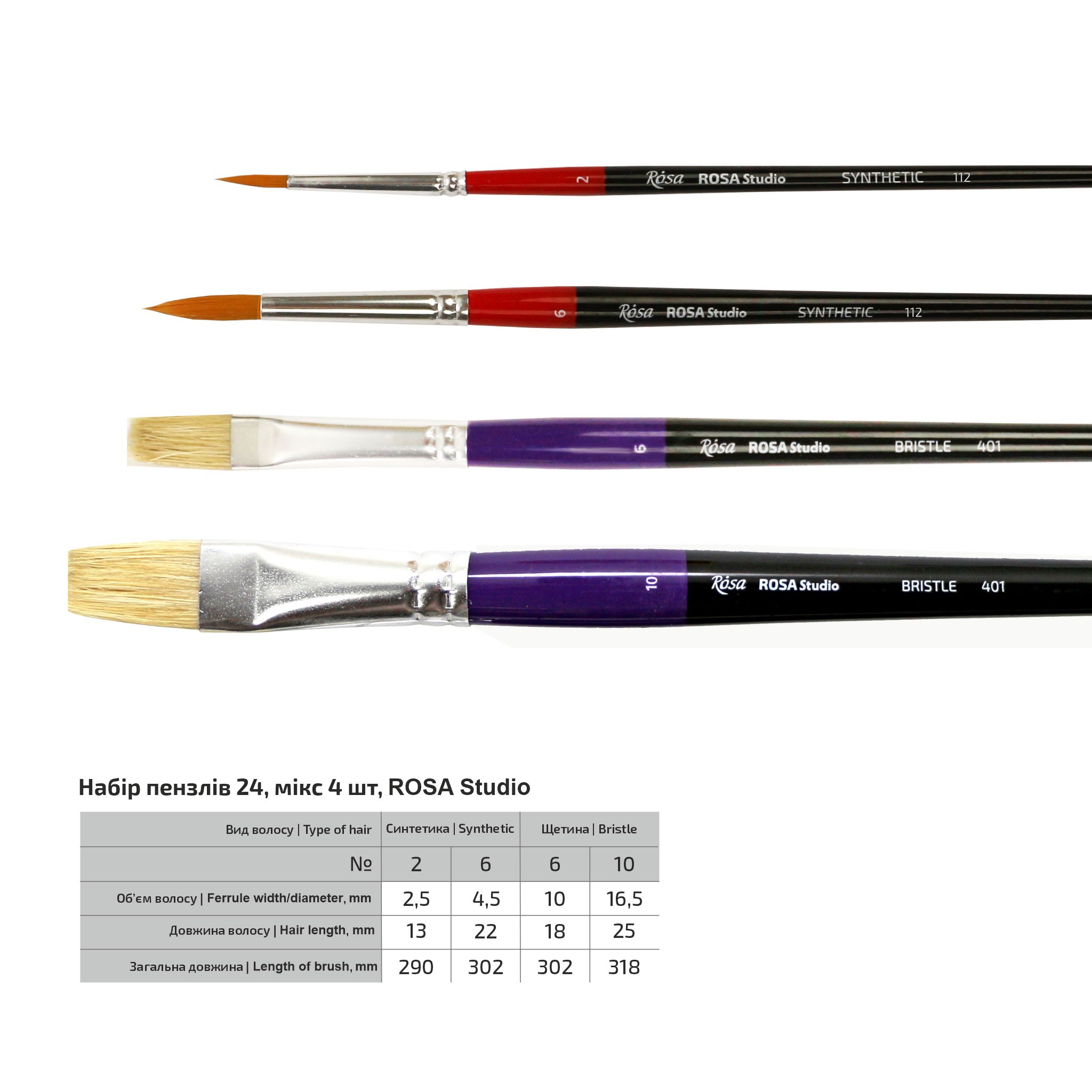24, mix 4pcs, synthetic (№2,6 – round), bristles (№6,10 – flat)