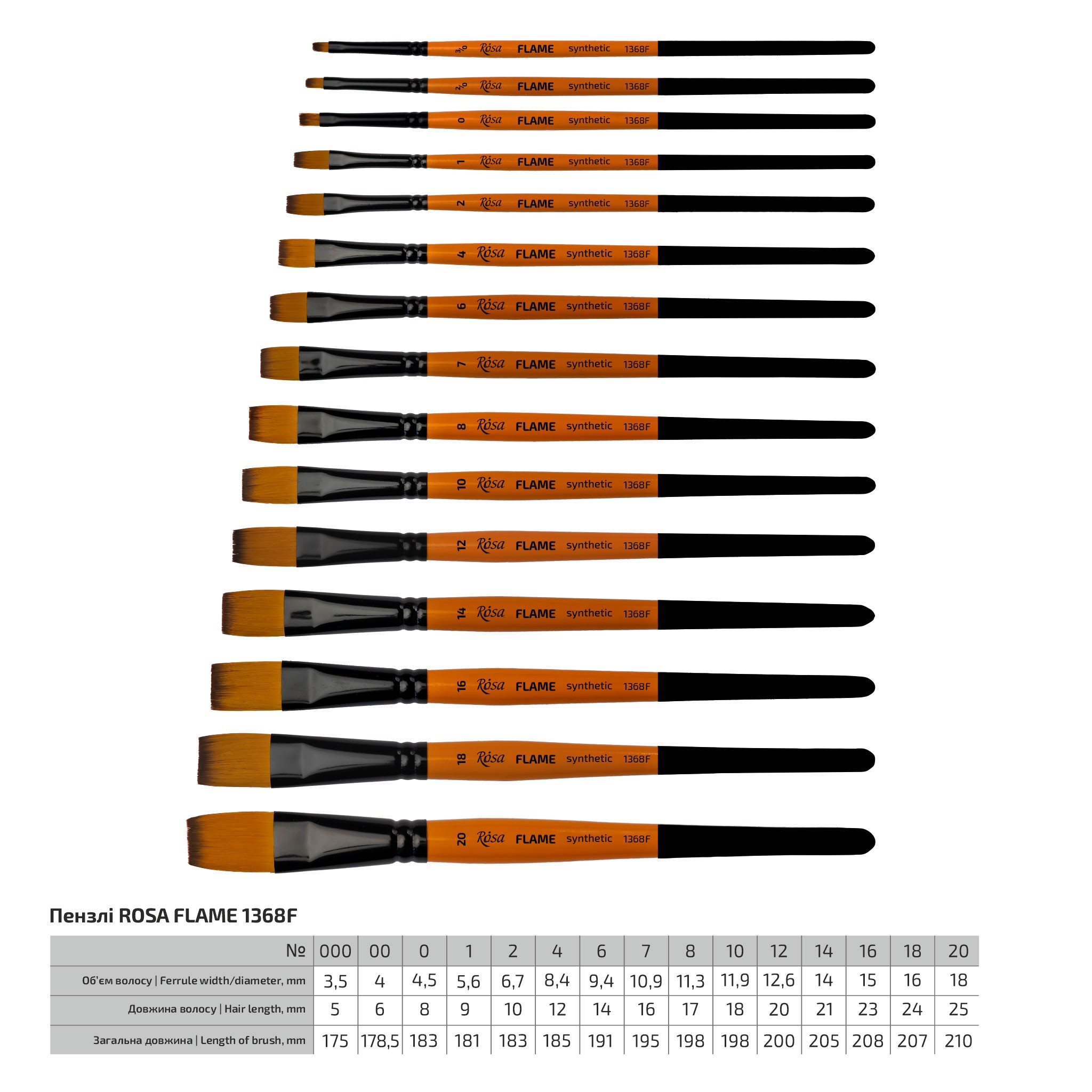 FLAME series. Brushes made of elastic synthetic hair of medium stiffness are ideal for working with acrylic and gouache paints.
