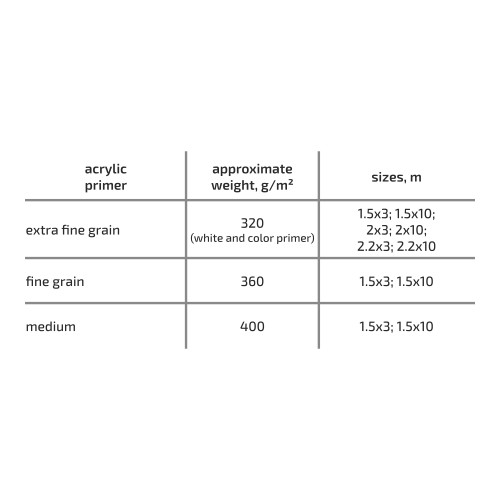 ROSA Gallery Hand Primed Cotton Canvas Rolls are a modern alternative to traditional linen canvases. ROSA Gallery canvases are of pure cotton, which makes them softer, more elastic and uniform compared to linen. The softness and elasticity of the cotton canvas facilitate its stretching on a stretcher. Being smooth, it is also an ideal surface for fine art portrait and still-live painting. ROSA Gallery cotton canvases are available in three kinds of grain texture with the 2 finished weight from 320 to 400 g/m . This allows the artists to choose the best canvas due to the genre ofa painting theyhave in mind.