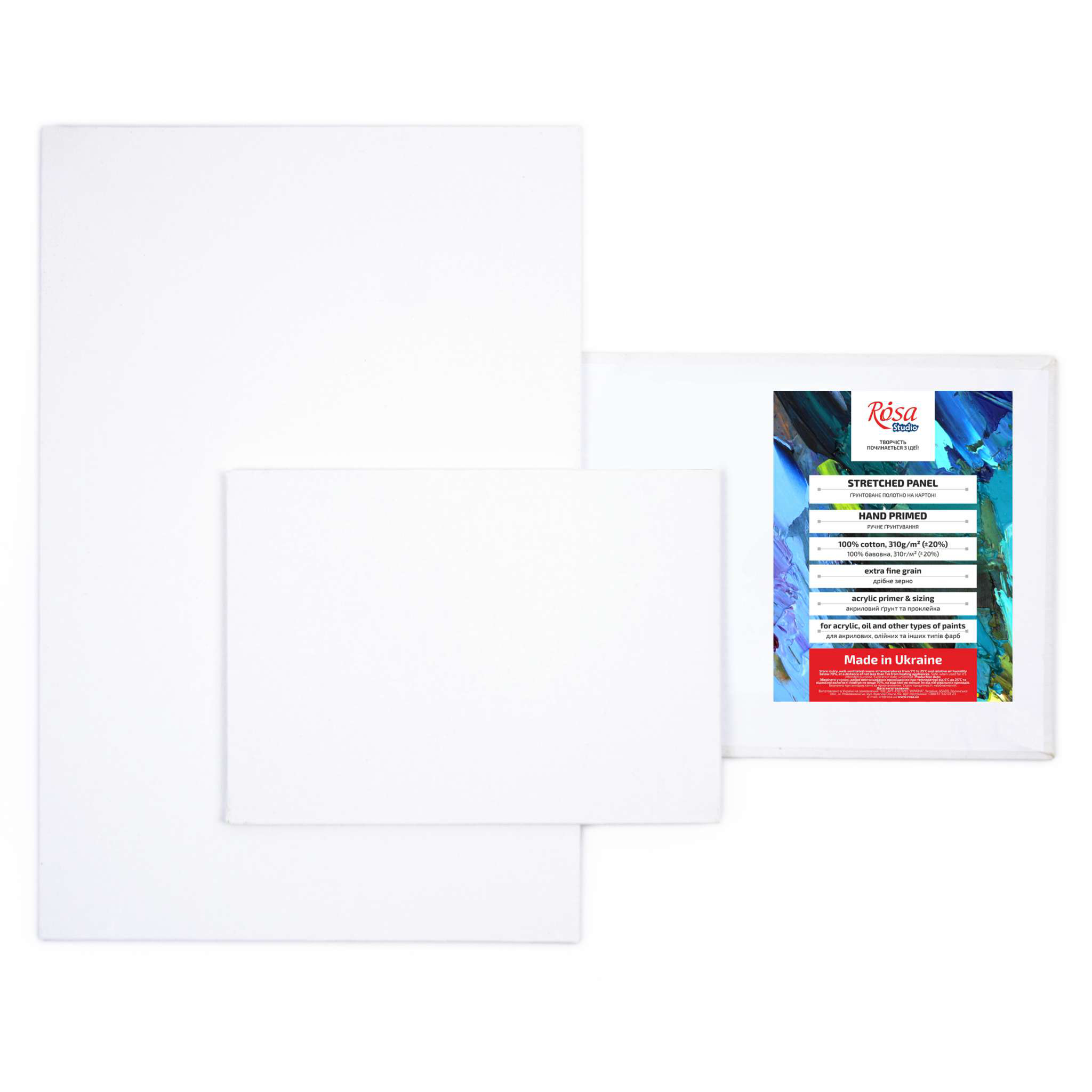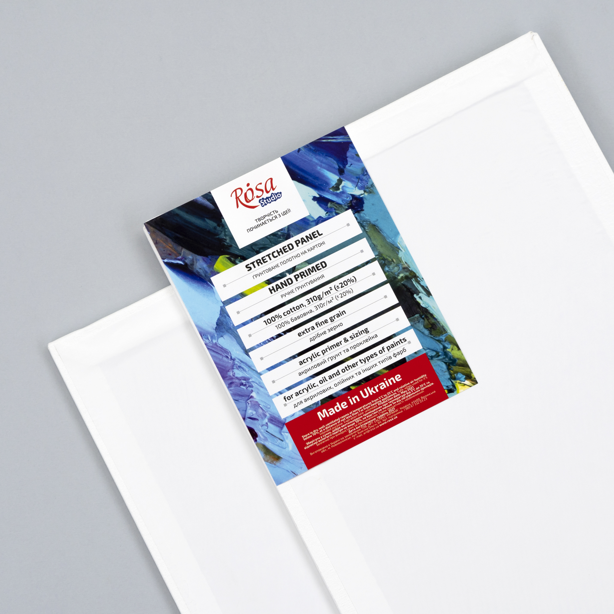 ROSA Studio Canvas Panels are very convenient for open air painting thanks to their light weight and small size. Different shapes of panels such as oval and round or classic rectangular open new possibilities for their application in both fine art and decoration. Prior to priming durable and elastic sizing is applied to canvases in order to prevent paint from penetrating. After sizing is applied, they are primed with a modern acrylic primer, which forms a durable and elastic white film once dry. We use a traditional white primer as well as priming in other colours for those who admire tinted ground.