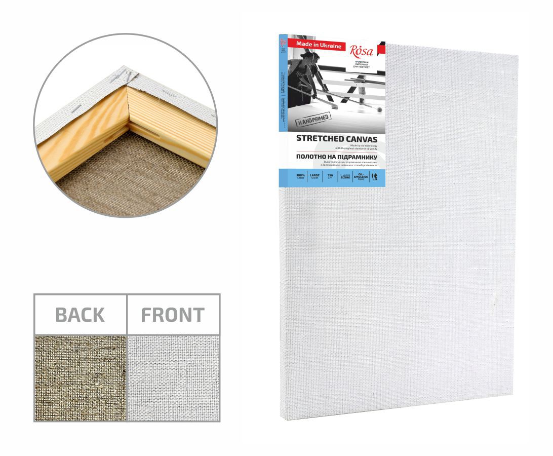 Stretcher bars are available in three sizes: 15x35mm, 18x40mm, 22x55mm. We use a definite stretcher bar size according to the size of a canvas stretcher following the world standards. ROSA Hand Primed Linen Stretched Canvas sizes range from 18×18 cm to 200×300 cm, with the interval of 5 cm. Customized sizes are also possible. canvas: pure linen sizing: three-layered primer: – acrylic four-layered – oil-emulsive four-layered stretcher bars: finger-joint pine (15x35mm, 18х40mm, 22х55mm) packing: each item is packed into the shrinkable transparent film.