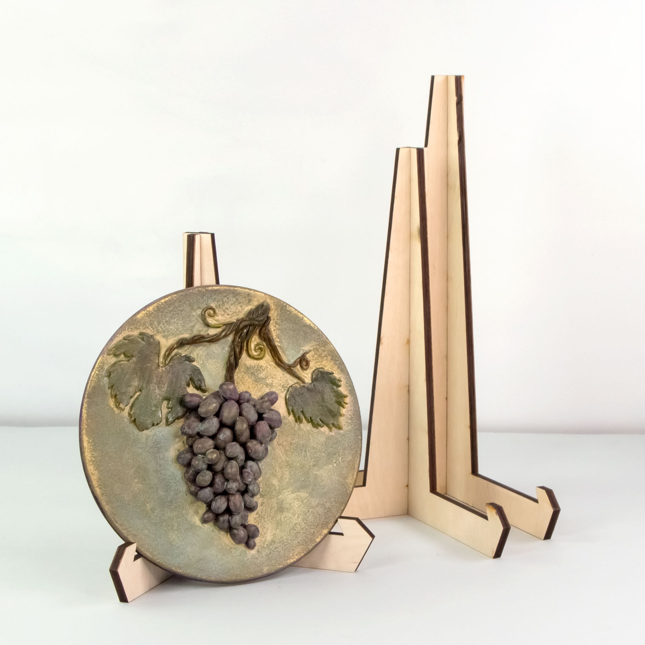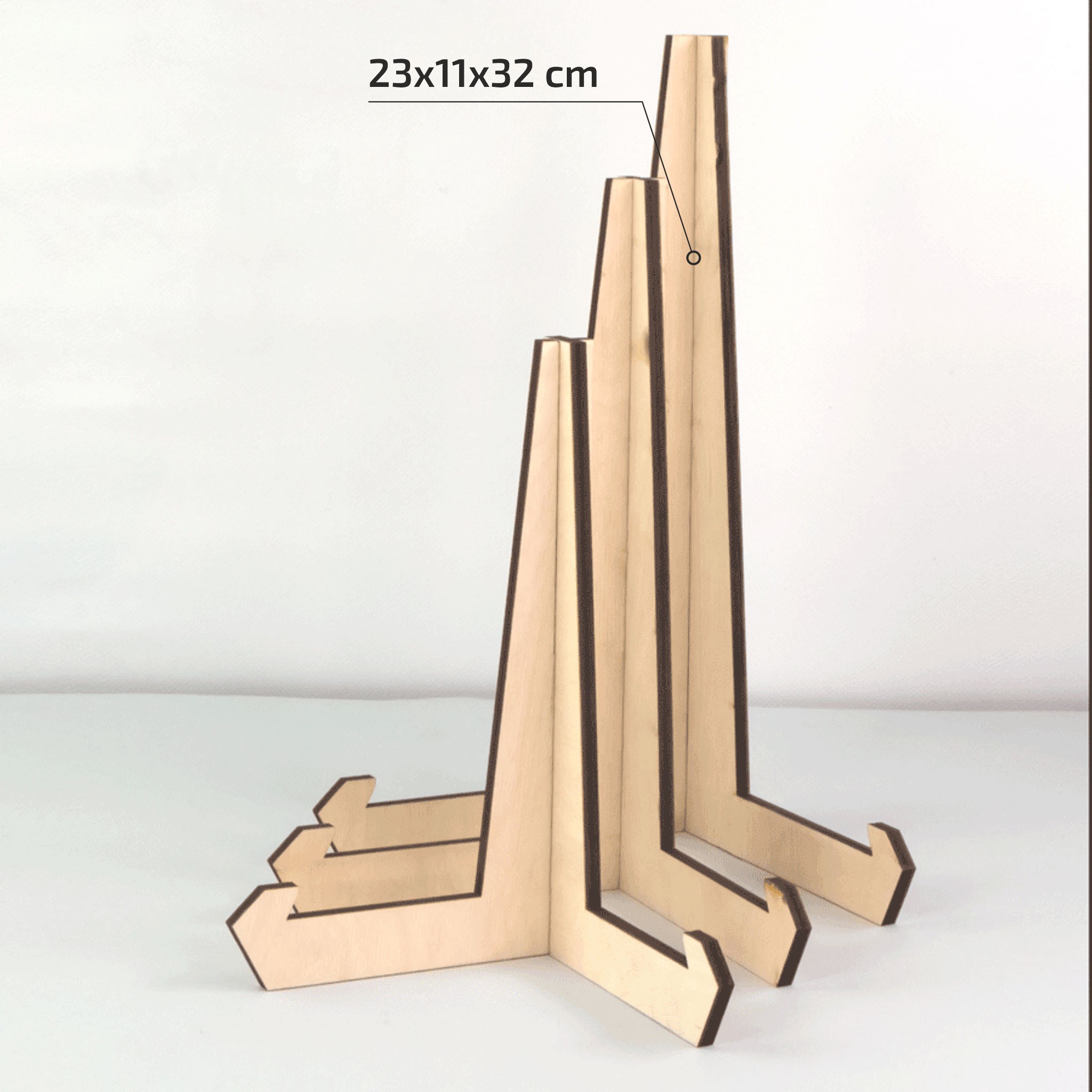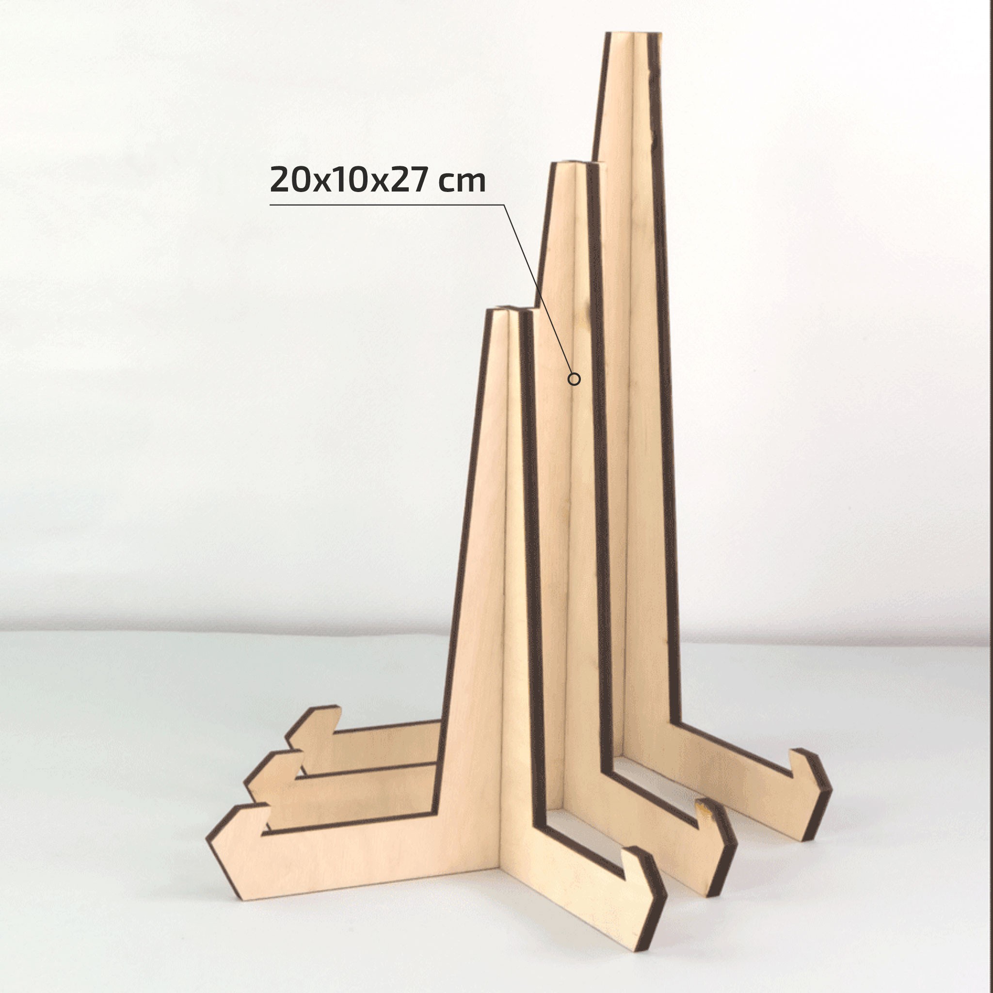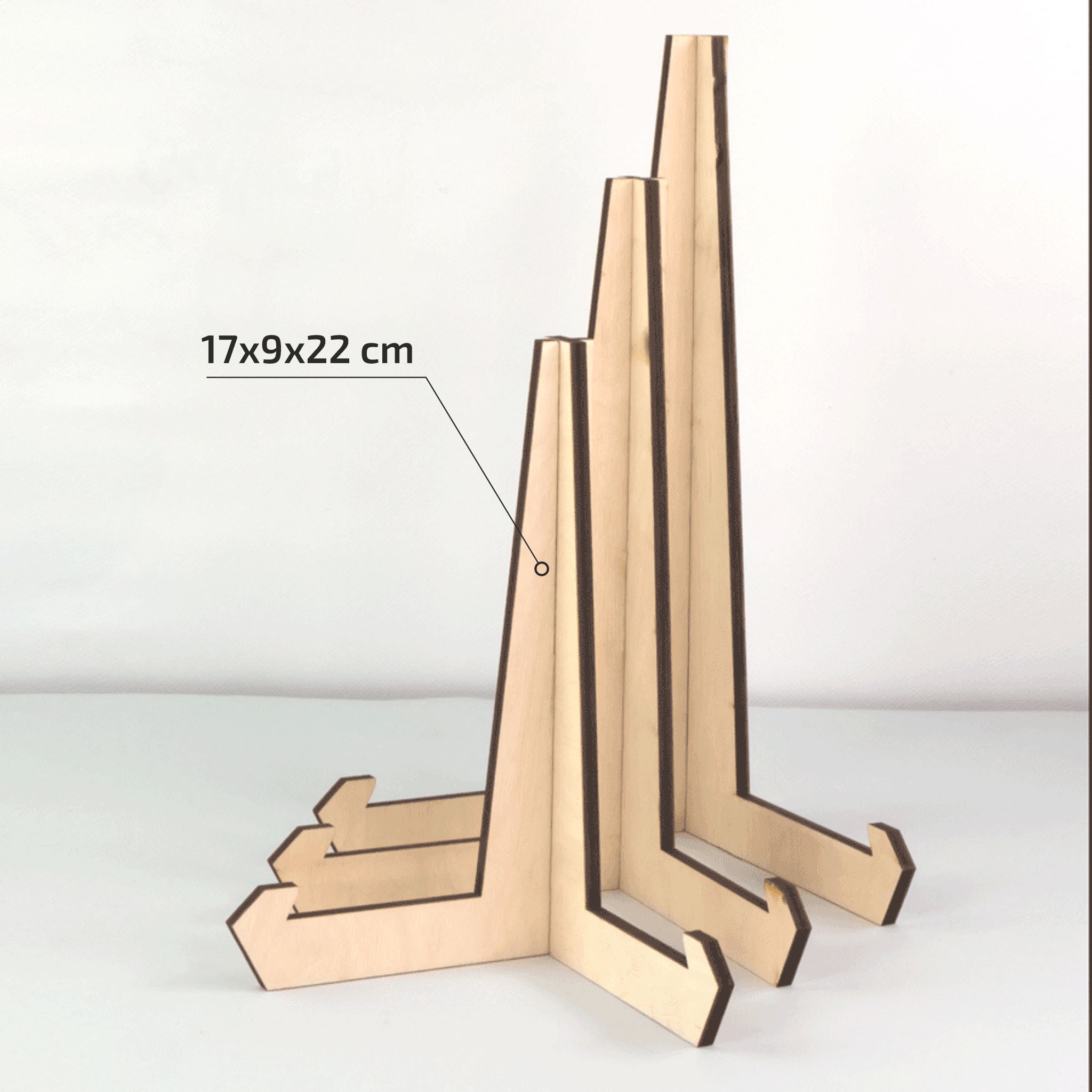 Souvenir tabletop easel-stand for products of sizes: A6, A5, A4. It is intended for the exposition of small-sized paintings, decorative plates, photographs, and presentation of goods in shop windows.