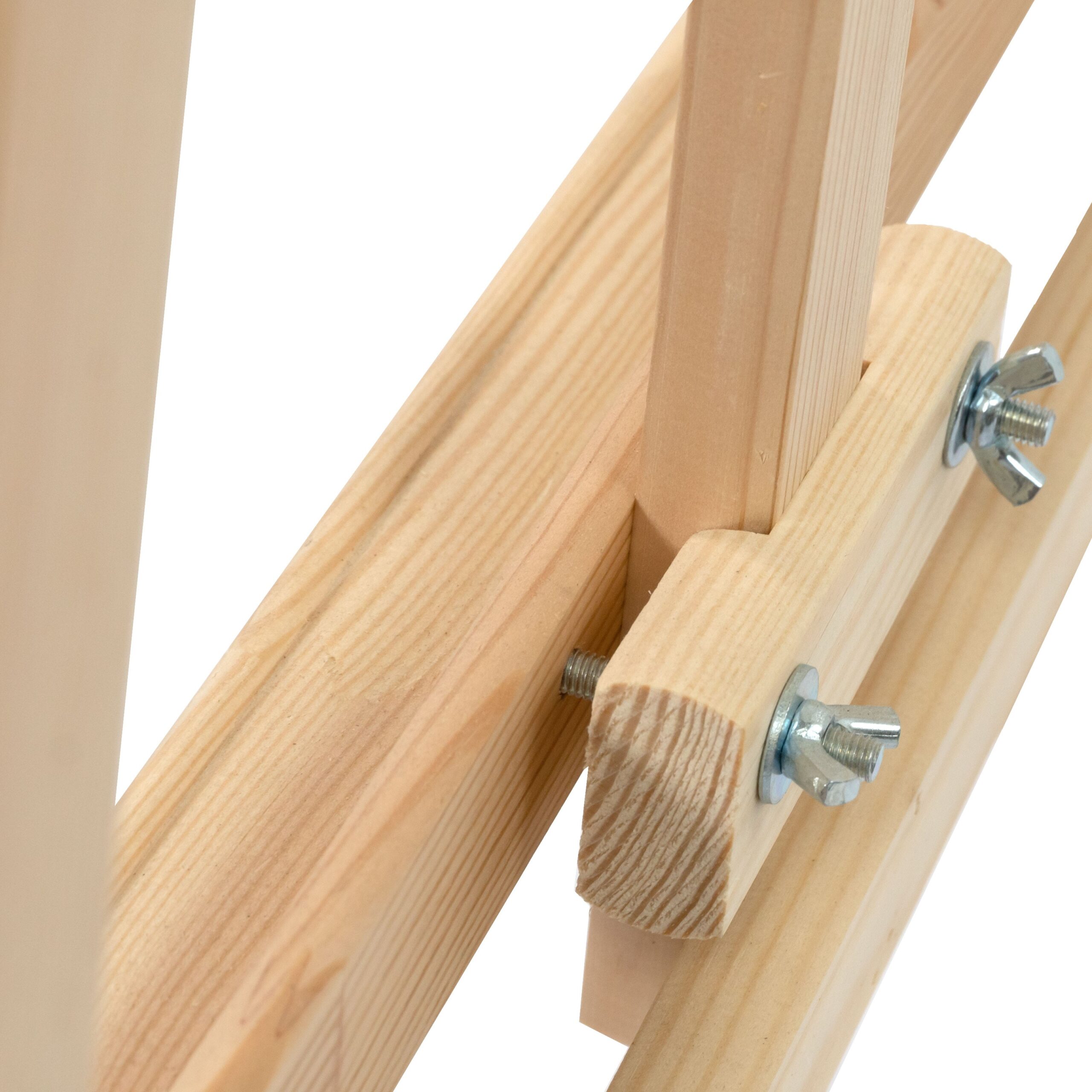 The easel is made of a lightweight natural pine frame, which makes it easy to carry. It has a three-point support, so it reliably stands on the surface. Smooth, easy adjustment of the tray allows you to fix the canvas at the required height, and a convenient slider reliably fixes the base for painting. The angle of inclination of the easel is adjustable, which allows you to set the desired inclination according to the nature of the work and the position of the artist, whether sitting or standing.
