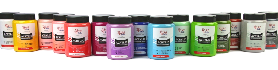 The acrylics are made of high-quality finely ground organic and inorganic pigments оn the basis of upto-dateacrylic dispersions. Their colour range is developed following the classic art methodology. ROSA Acrylics have 45 basic opaque and semi-transparent colours.