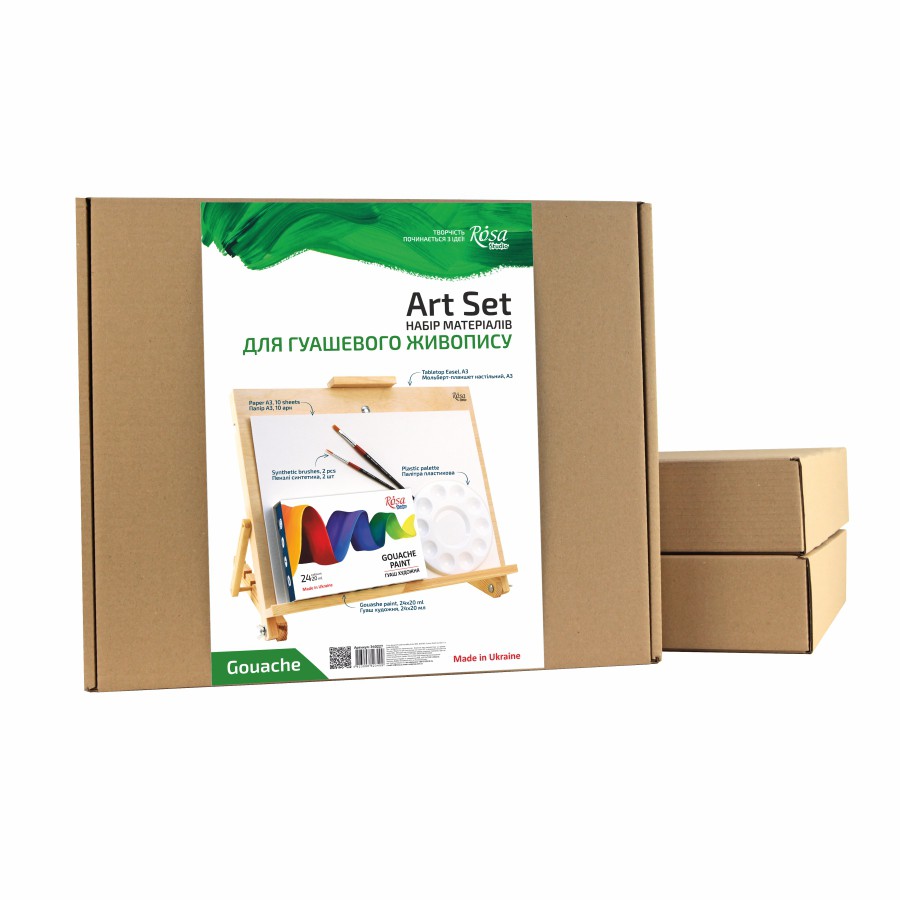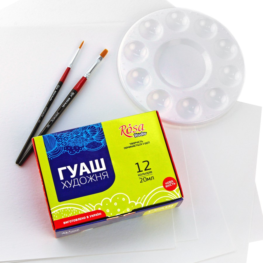 • A set of ROSA Studio 24 gouache paints, 20 ml each, containing the entire palette of ROSA Studio gouache paints, except for metallics. A wide range of colours will allow you to use the ready-made colours at once, without mixing.