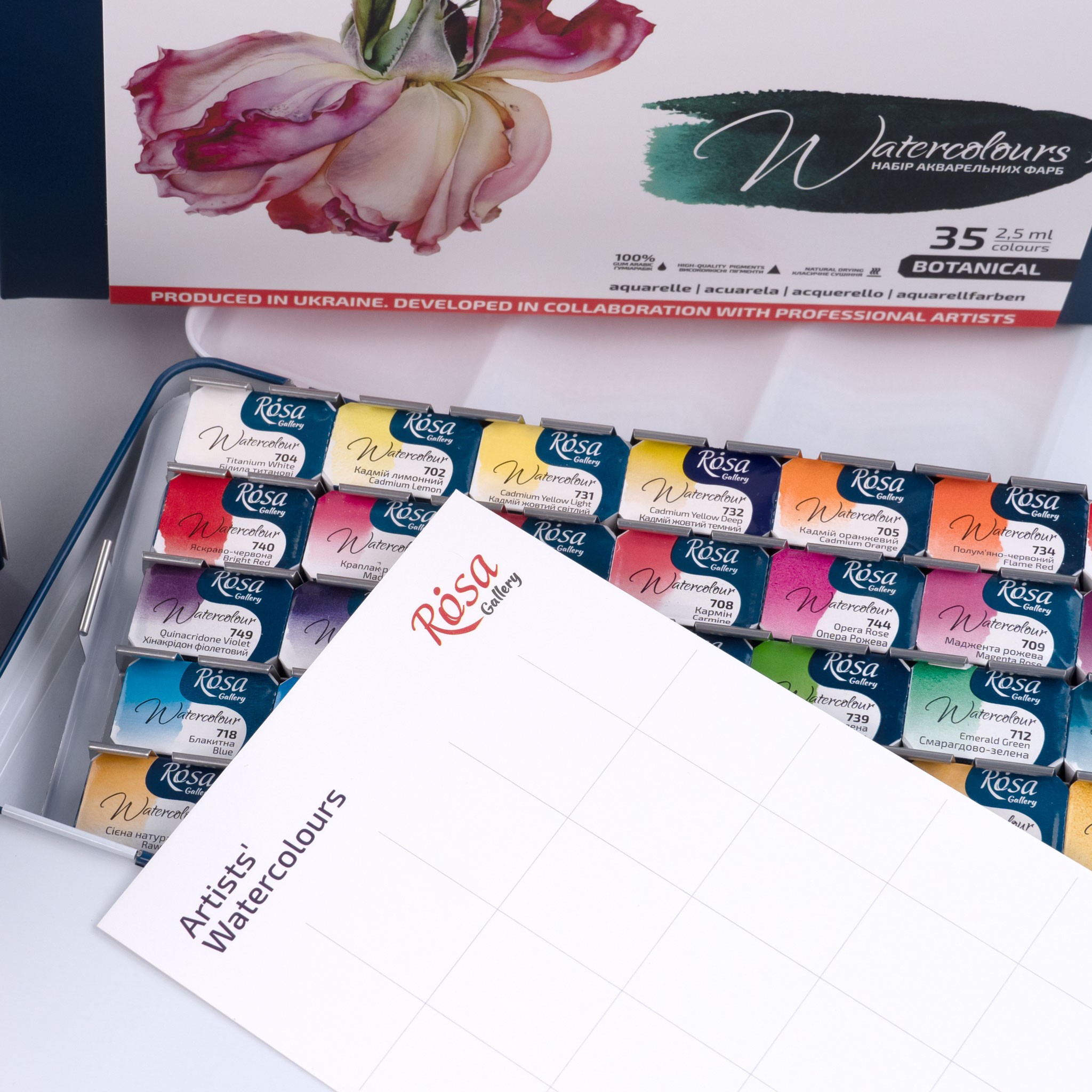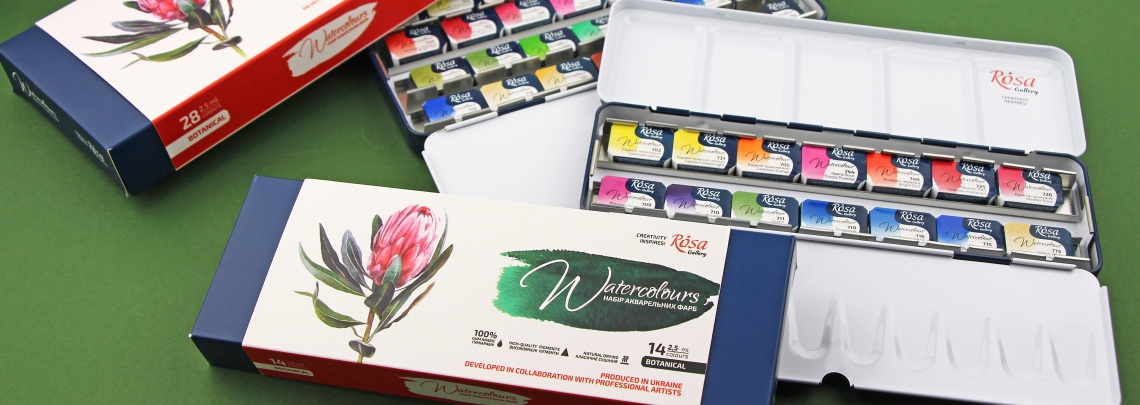 A sets of Fine Art professional watercolour paints “BOTANICAL” of 14, 28, 35 colours is intended for connoisseurs of botanical illustration. An airy, multi-layer botanical illustration requires high-quality watercolours and a careful selection of colours. Transparent single pigment colours in the set of ROSA Gallery Professional Artists’ Watercolours Botanical for clean and predictable mixes.