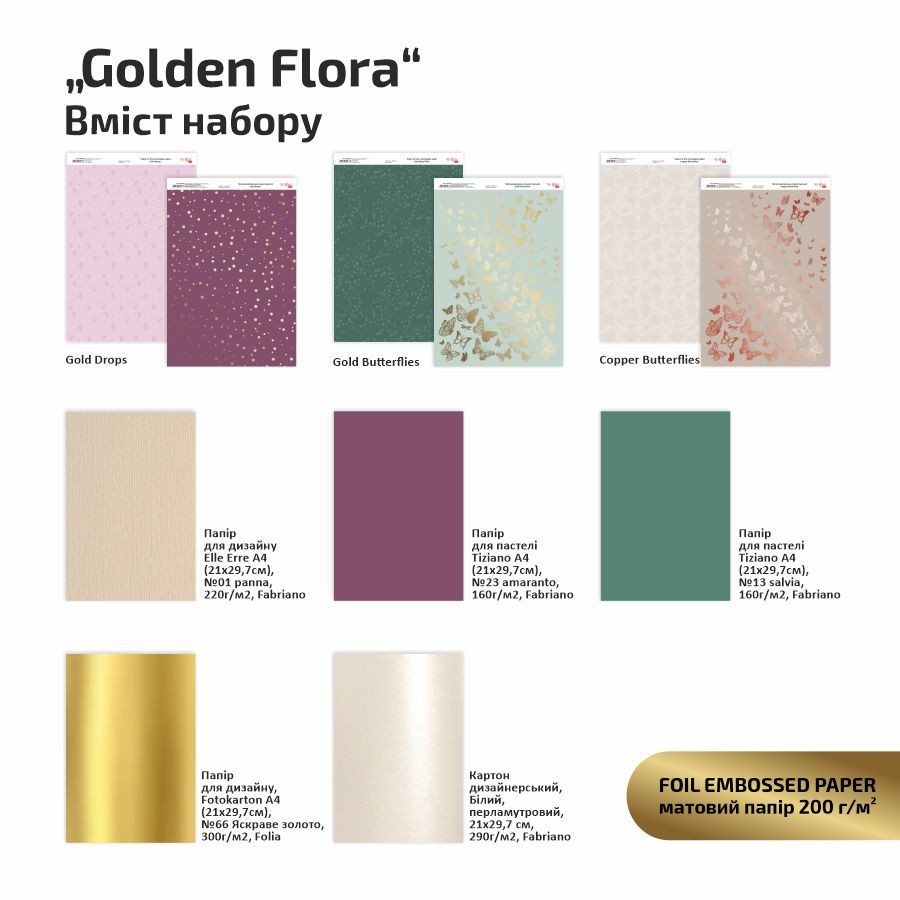 The sets consist of new foil paper and sheets with various interesting textures and effects to combine and create a product in one style. Each set contains 3 sheets of foil-stamped paper, 2 basic light or dark sheets for the base of the card, or scrap page, 1 sheet of paper with a metallic effect, and 1 with pearl. All you need to do is choose the design and colour scheme to your liking and enjoy the process of creating a product with your own hands!