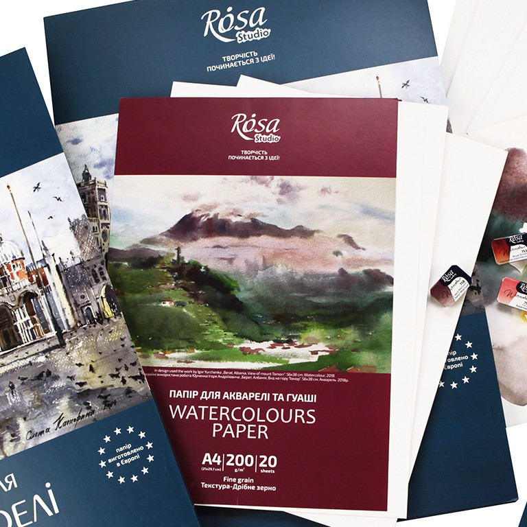 Папки для акварелі ROSA Studio містять аркуші акварельного паперу білого кольору, щільністю 200 г/м та текстурою середнє зерно.