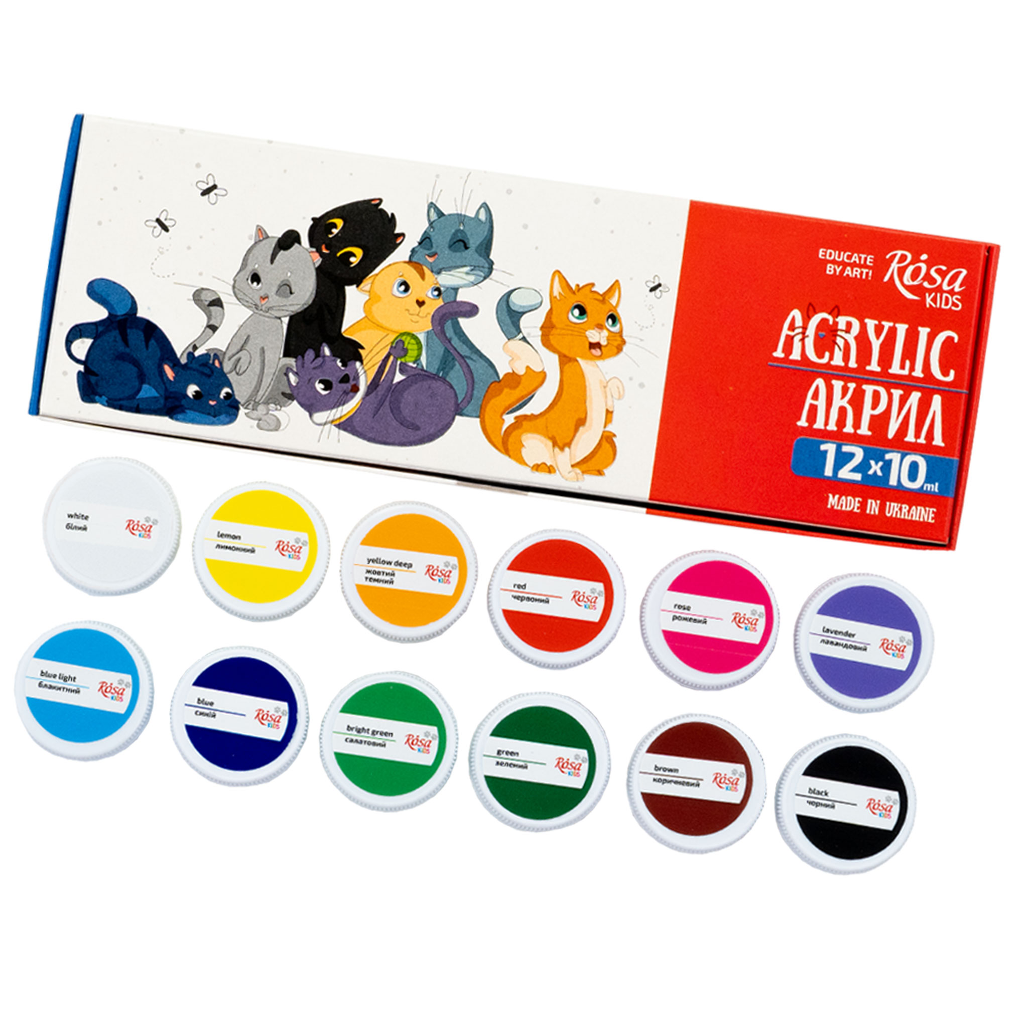 Набори акрилових фарб для дітей від ROSA Kids з улюбленими котячими пригодами — безліч можливостей для вираження їх творчості й фантазії.