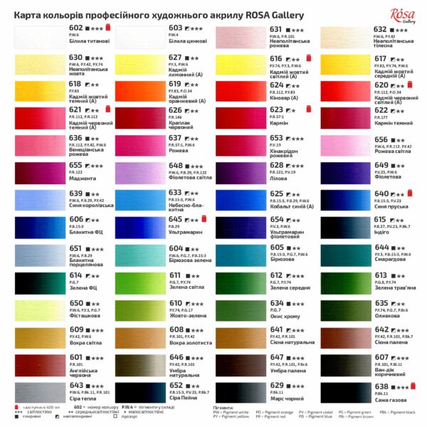 Фарби акрилові художні ROSA Gallery – розроблені для живопису з урахуванням вимог та рекомендацій професійних художників. Виготовлені з високоякісних органічних та неорганічних пігментів високого ступеня перетертості на основі сучасних акрилових дисперсій.