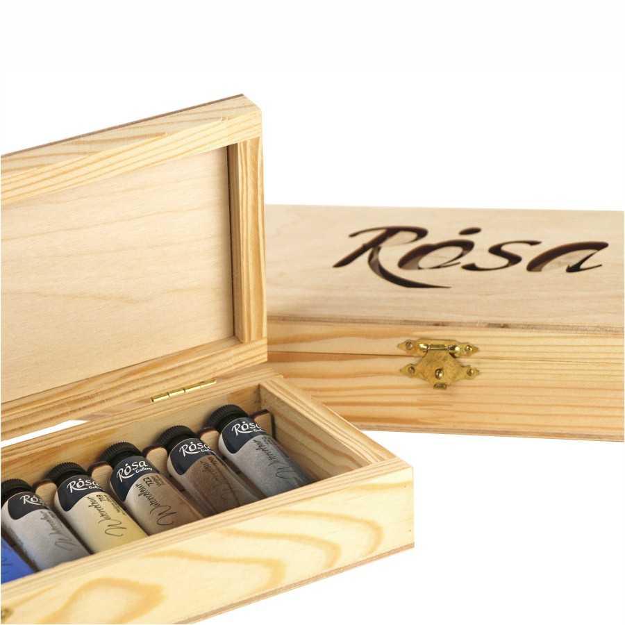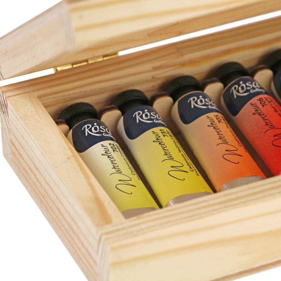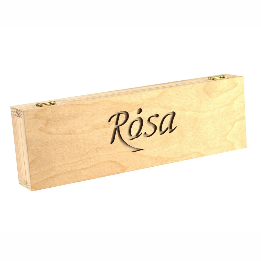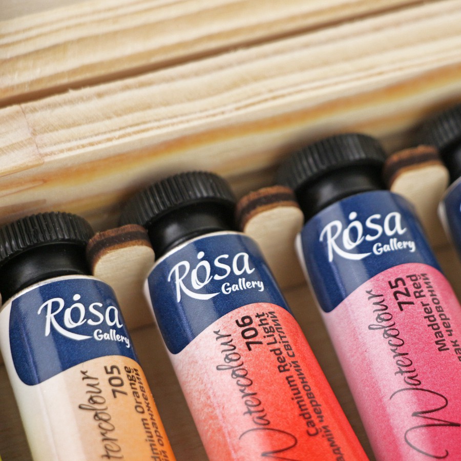 Завдяки стильному дизайну обгортки та дерев’яному пеналу з кришкою-палітрою та гравійованим логотипом набір акварельних фарб CLASSIC ROSA Gallery в тубах стане вишуканим подарунком для професійного художника.