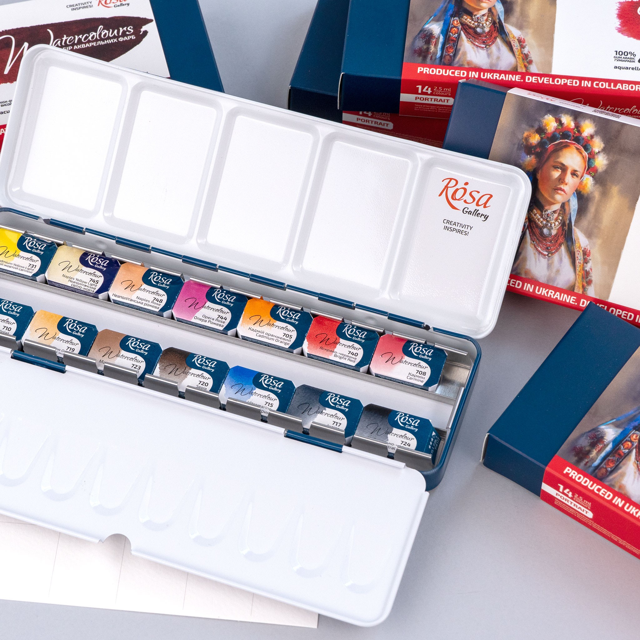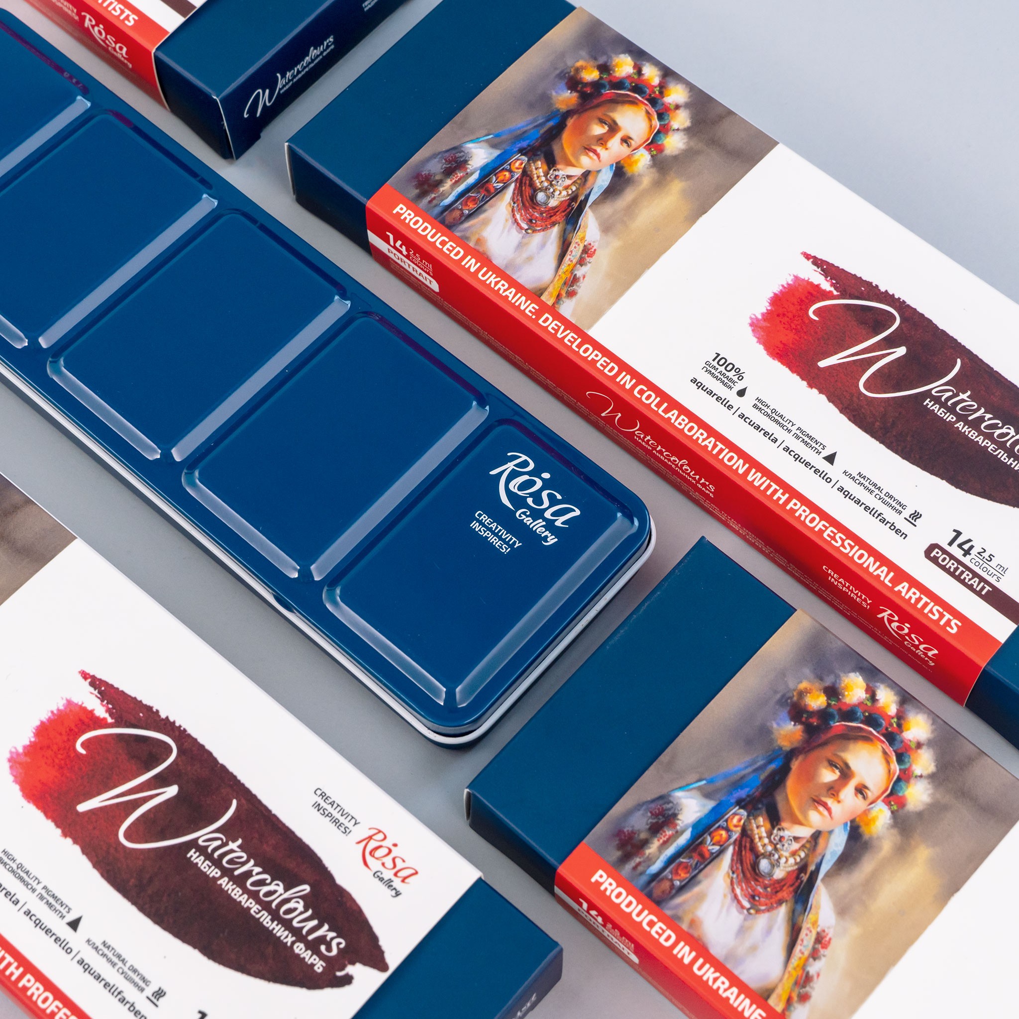 Набір професійних художніх акварельних фарб PORTRAIT на 14 кольорів від ROSA Gallery сформований з кольорів, що дозволяють отримати широку палітру для відображення людського тіла. Більшість кольорів у наборі одно пігментні, що дає можливість утворювати чисті відтінки при змішуванні.