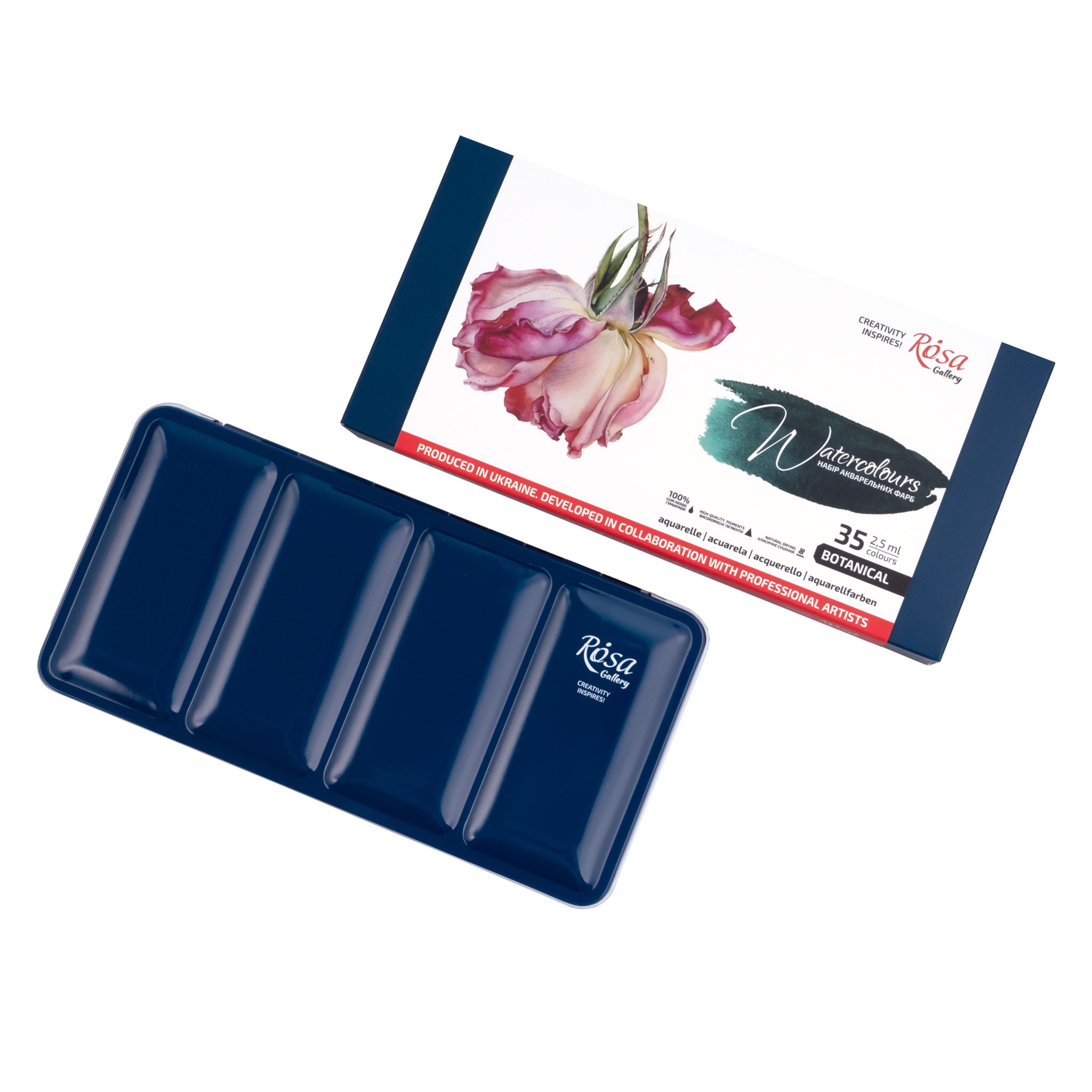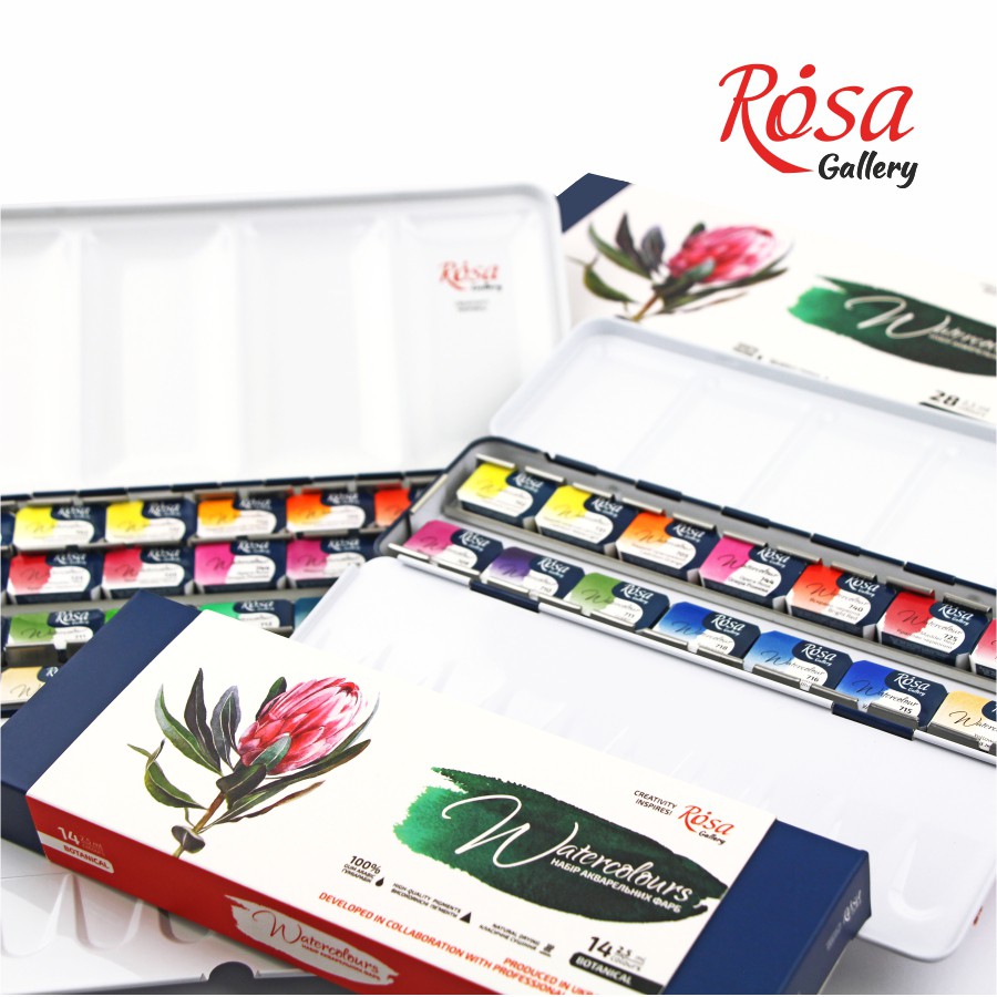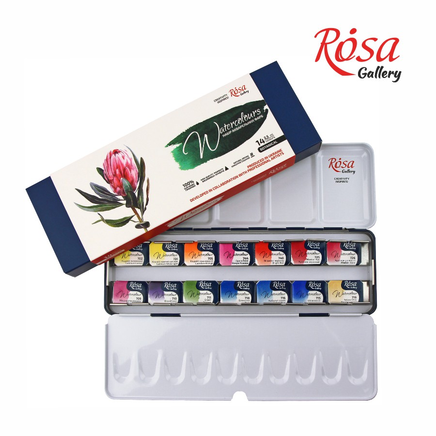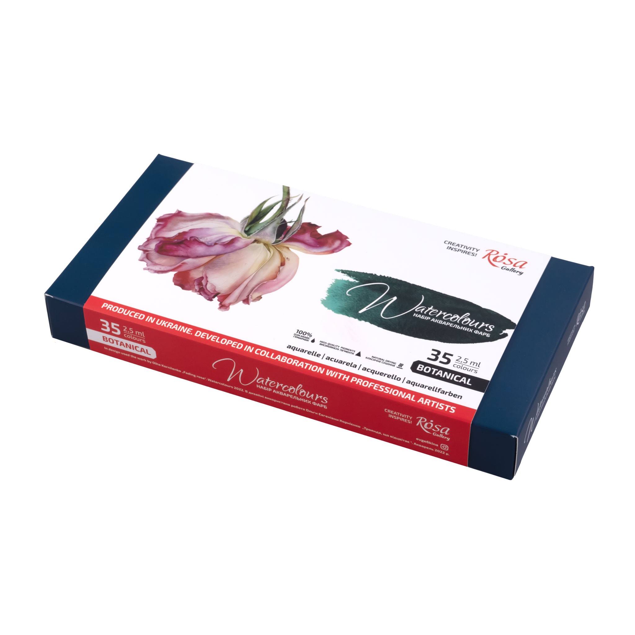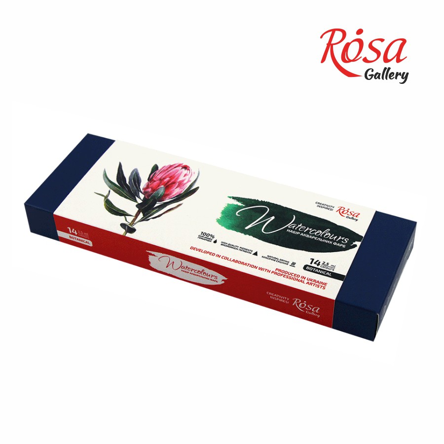 Набори професійних художніх акварельних фарб Botanical на 14, 28, 35 кольорів призначені для поціновувачів ботанічної ілюстрації. Повітряність та багатошаровість, що властиві ботанічній ілюстрації, забезпечуються прозорістю акварельних фарб. Чистота у сумішах досягається домінуванням у палітрі одно пігментних кольорів. Набір професійних художніх акварельних фарб Botanical від ROSA Gallery поєднав у собі саме ці властивості.
