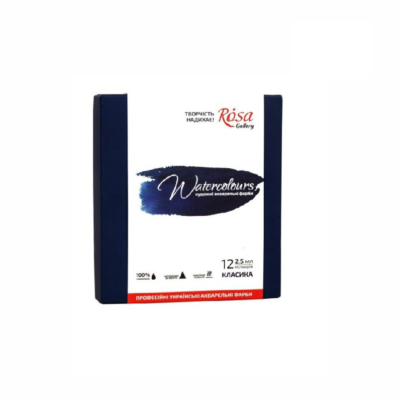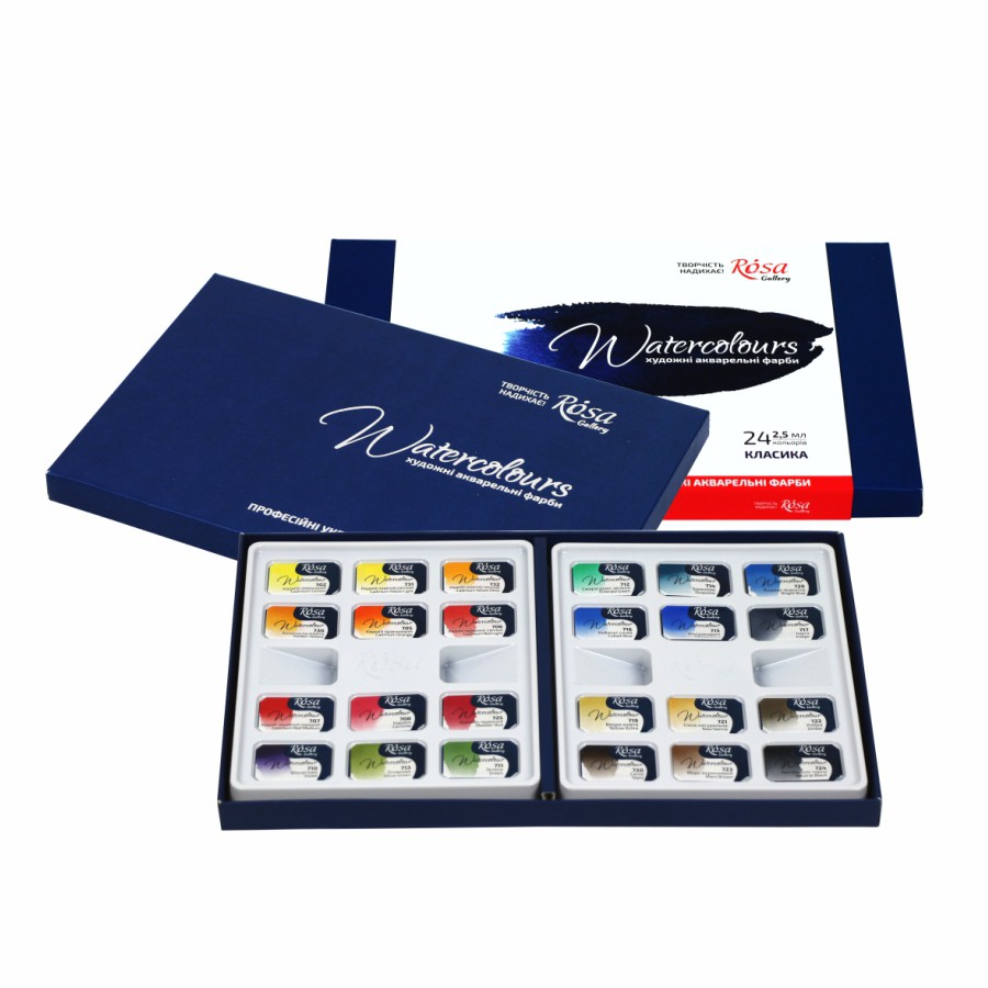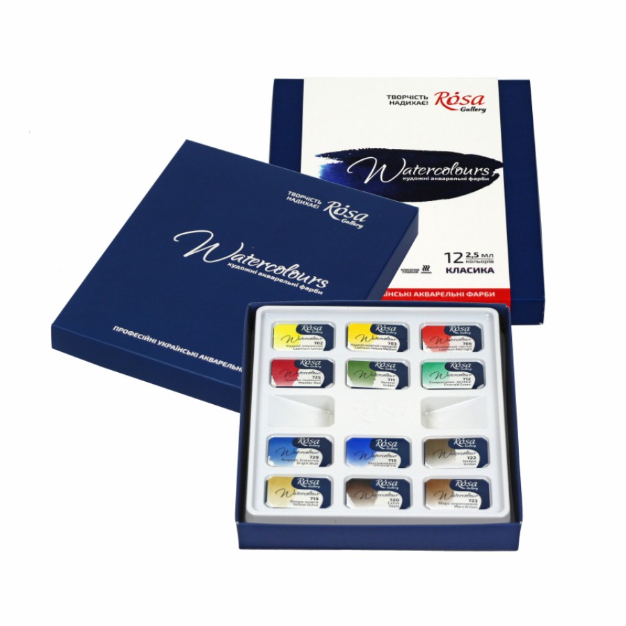 Набори акварелі CLASSIC ROSA Gallery на 12 і 24 кольори запаковані в оксамитовий, приємний на дотик, якісний цупкий картон Cпеціальний блістер, із заглибленнями для уникнення змішування/перетікання кольорів між собою та піднятим краєм, що запобігає витіканню води в коробку