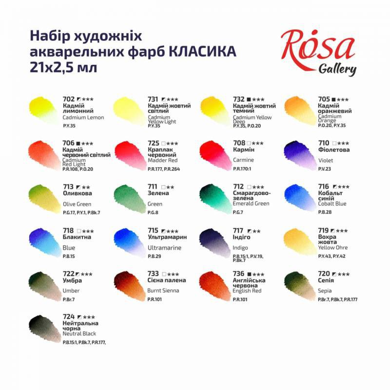 702 – Кадмій лимонний, 731 – Кадмій жовтий світлий, 732 – Кадмій жовтий темний, 705 – Кадмій оранжевий, 706 – Кадмій червоний світлий, 708 – Кармін, 725 – Краплак червоний, 710 – Фіолетова, 713 – Оливкова, 711 – Зелена, 712 – Смарагдово-зелена, 716 – Кобальт синій, 718 – Блакитна, 715 – Ультрамарин, 717 – Індіго, 719 – Вохра жовта, 722 – Умбра, 733 – Сієна палена, 736 – Англійська червона, 720 – Сепія, 724 – Нейтрально-чорна.