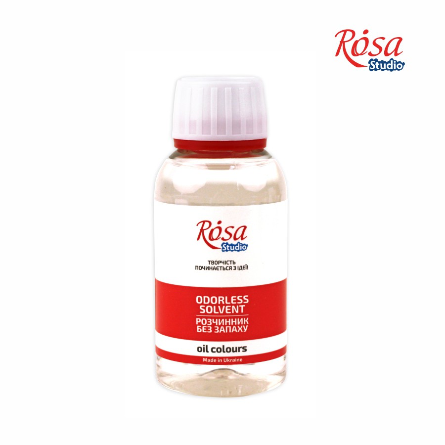 Розчинник без запаху ROSA Studio – деароматизований розчинник, призначений для художніх робіт: розведення олійних фарб, зменшення їх в’язкості та для очищення пензлів, палітр, полотен. Завдяки деароматизації підходить для роботи в приміщеннях і може використовуватись особами чутливими до запахів. Слід пам’ятати, що розчинник без запаху має випаровування, тому робочі приміщення: майстерні, студії, навчальні аудиторії потребують періодичного провітрювання або встановлення спеціальних витяжних систем.