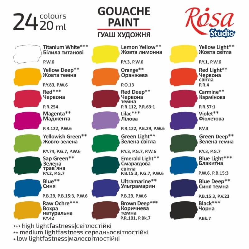 Гуашеві фарби ROSA Studio розроблені висококваліфікованими технологами ROSA з урахуванням вимог та рекомендацій викладачів художніх навчальних закладів. Фарби виготовлені з якісних пігментів та натуральної рослинної основи. Фарби доступні поштучно та в наборах.