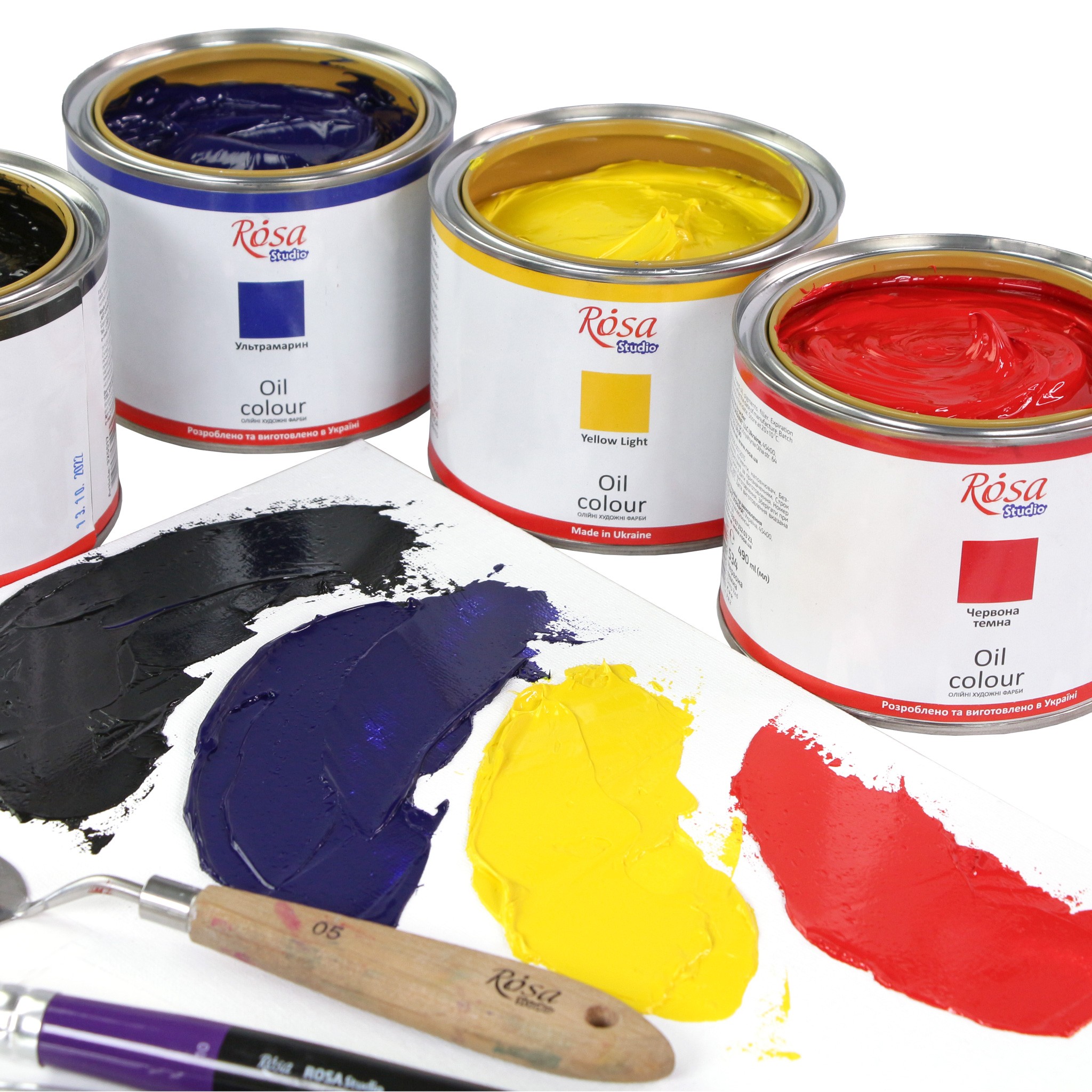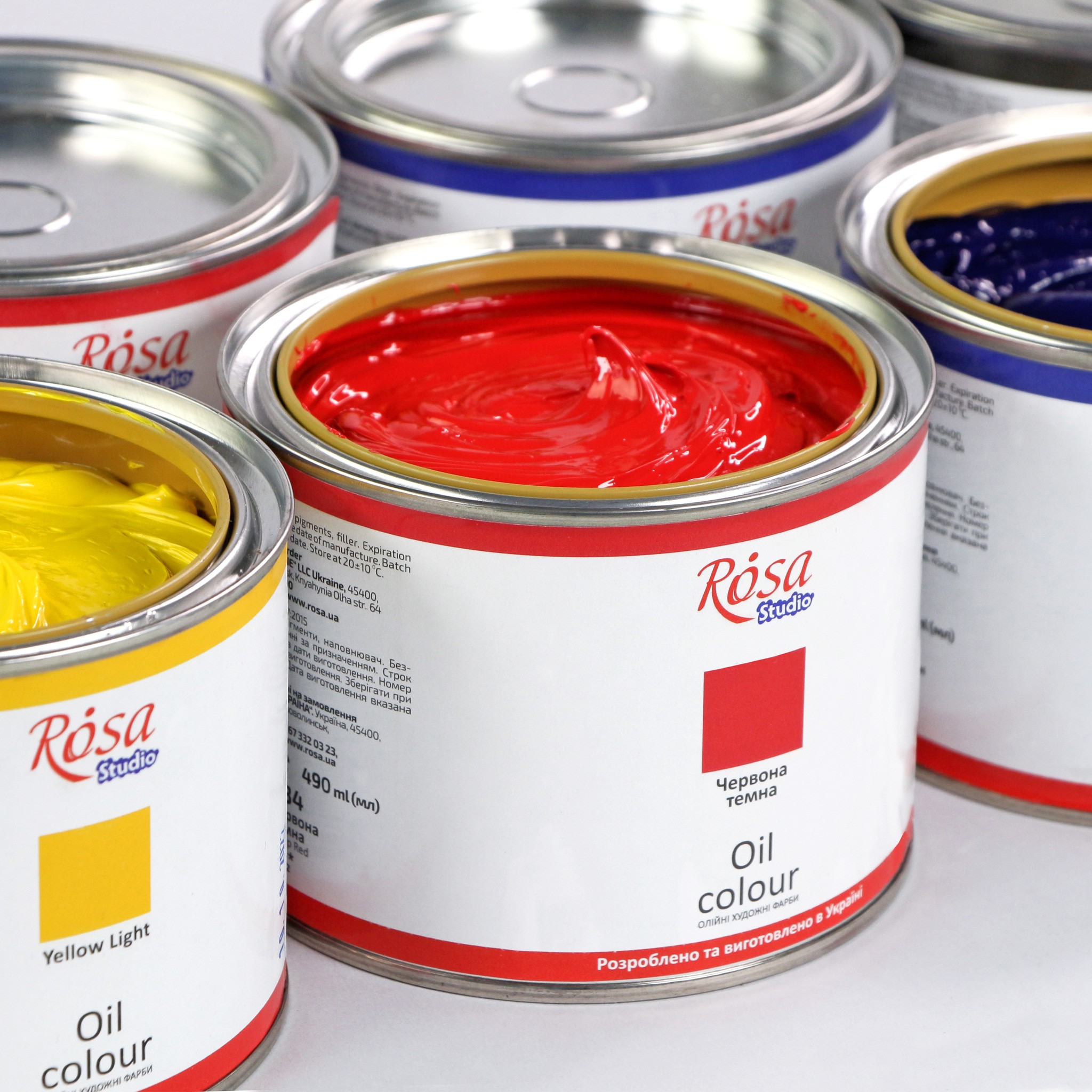 В банках 490 мл можна придбати 5 основних кольорів олійних фарб ROSA Studiо:
