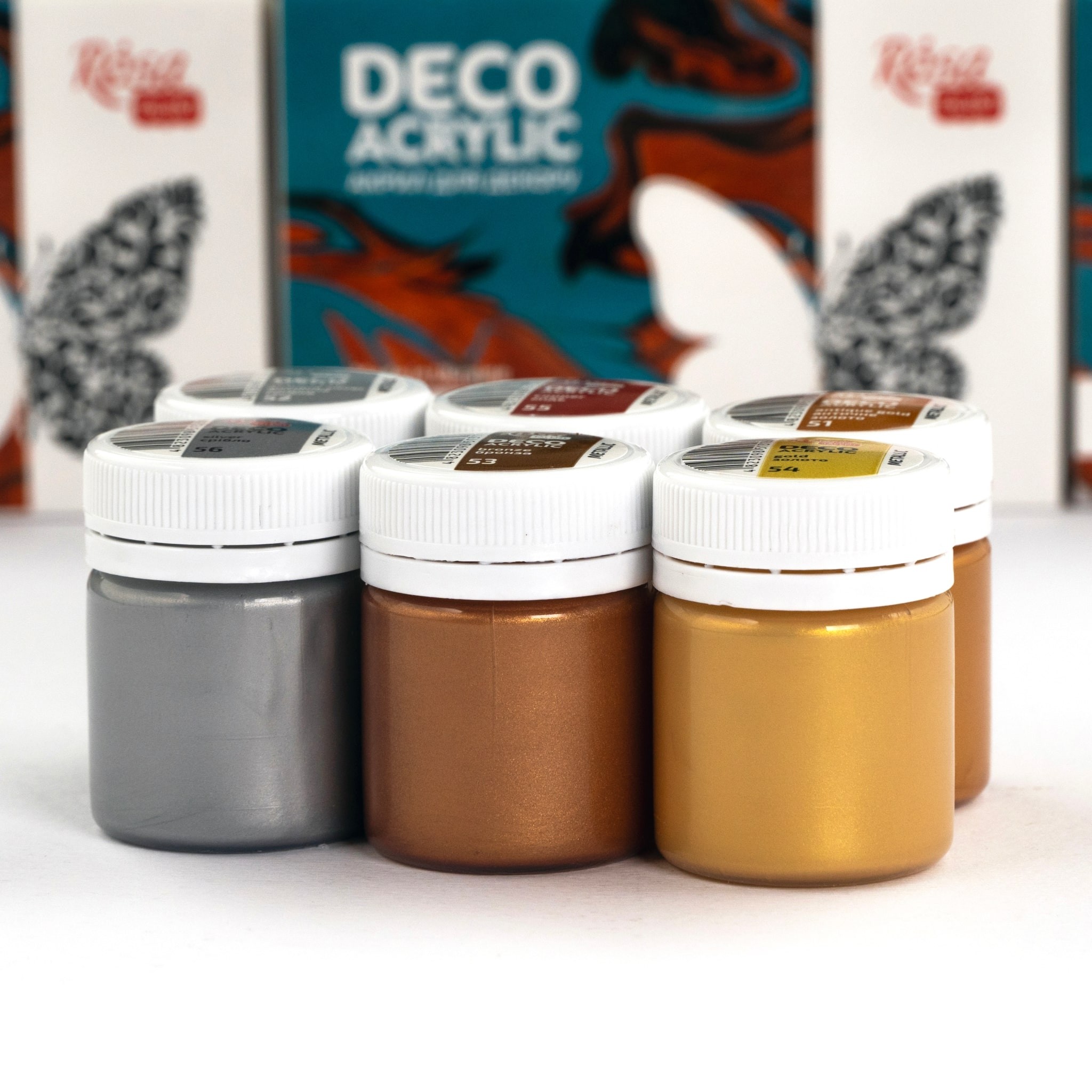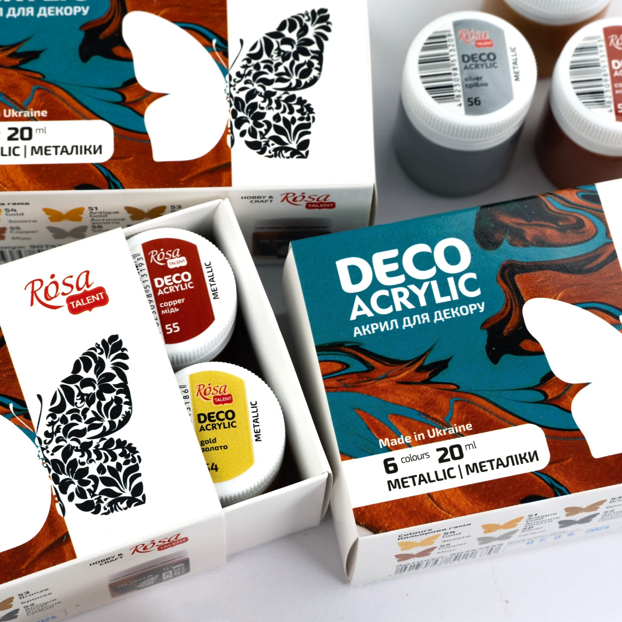 Акрил для декору ROSA Talent METALLIC – однорідні покривні фарби, які додадуть блиску, сяйва та вишуканості задекорованому виробу. Це гарний вибір для створення святкових декорацій, оформлення листівок, декорування заготовок.