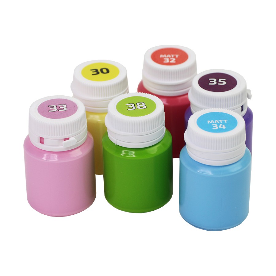 Фарби вирізняються ніжними пастельними кольорами, хорошою адгезією та водостійкістю після висихання. Легка консистенція забезпечує легке нанесення фарби на поверхню. Акрилові фарби можна розбавляти водою, а також змішувати кольори між собою, отримуючи нові відтінки. Після висихання фарби утворюють незмивну плівку, що дозволяє використовувати задекоровані речі у побуті. На речах, що постійно перебувають у користуванні малюнок, або виріб в цілому, можна додатково зміцнити, покривши лаком на водній основі. З плином часу фарби залишаються стійкими та зберігають свій яскравий колір.