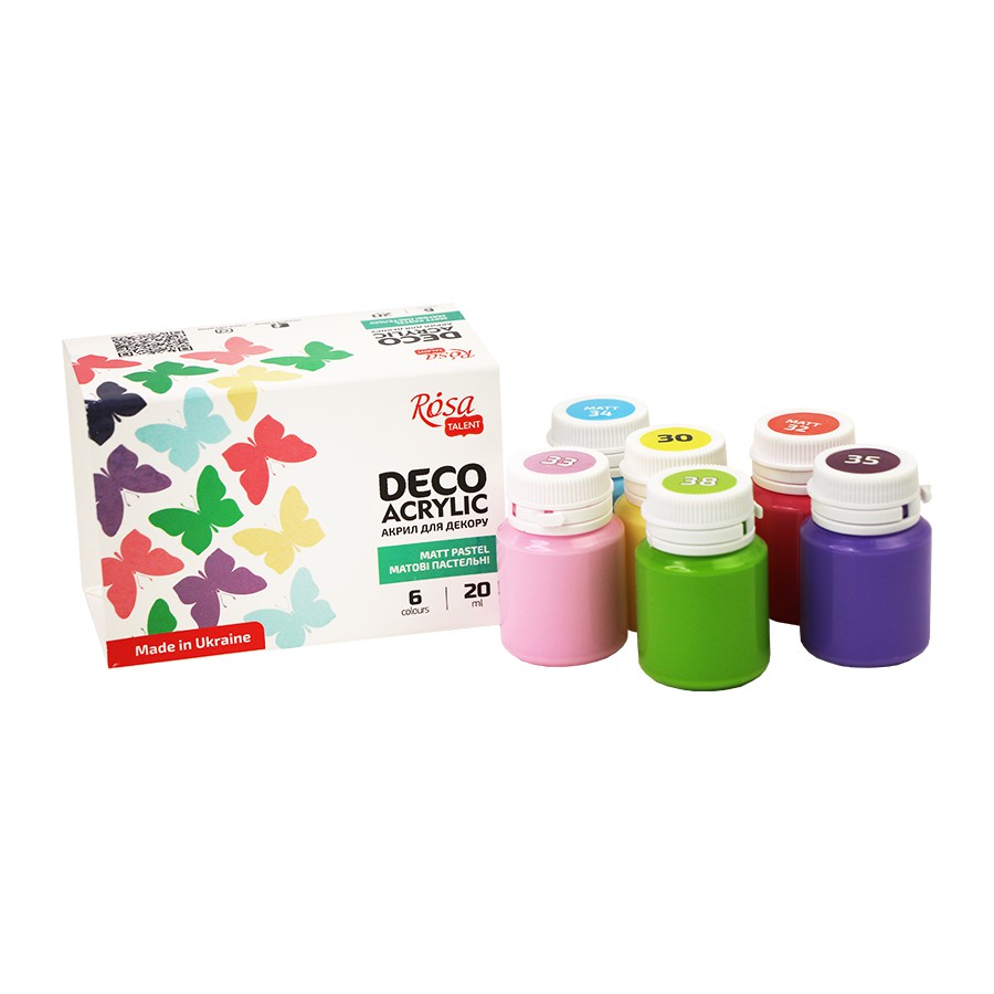Пастельний акрил для декору ROSA Talent доступні в об’ємі 20 мл, що є дуже зручним для роботи з трафаретами та дрібними заготовкам.