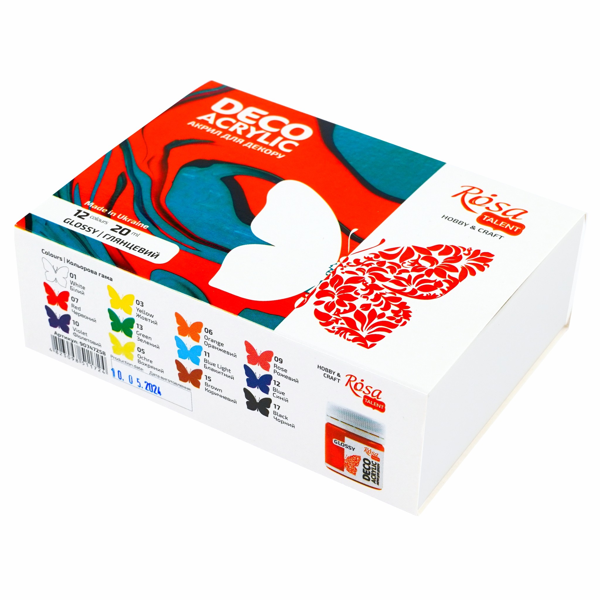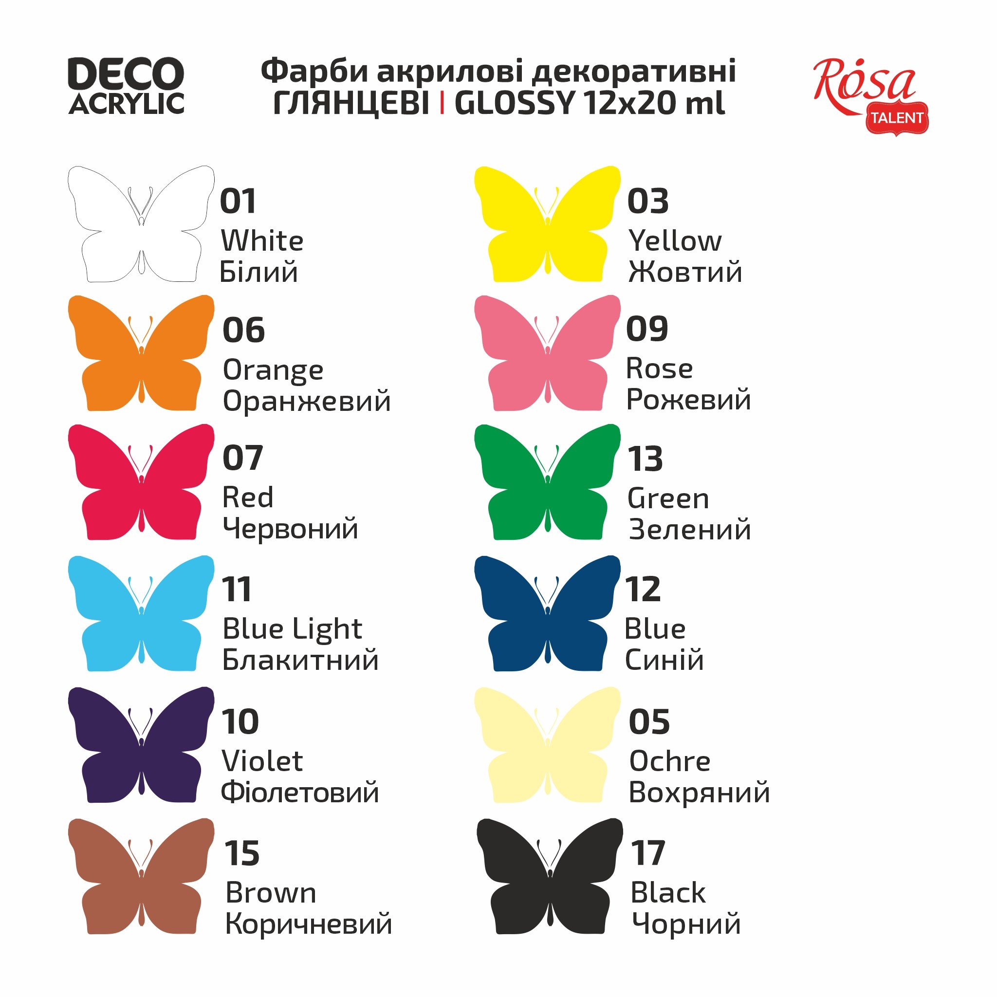 Глянцевий акрил для декору ROSA Talent – однорідні покривні фарби, які після висихання створюють глянцевий ефект та додають делікатного блиску задекорованим виробам. Доступні в об’ємі 20 мл, що є дуже зручним для роботи з трафаретами та дрібними заготовкам. Представлено наборами на 6, 9 та 12 кольорів.