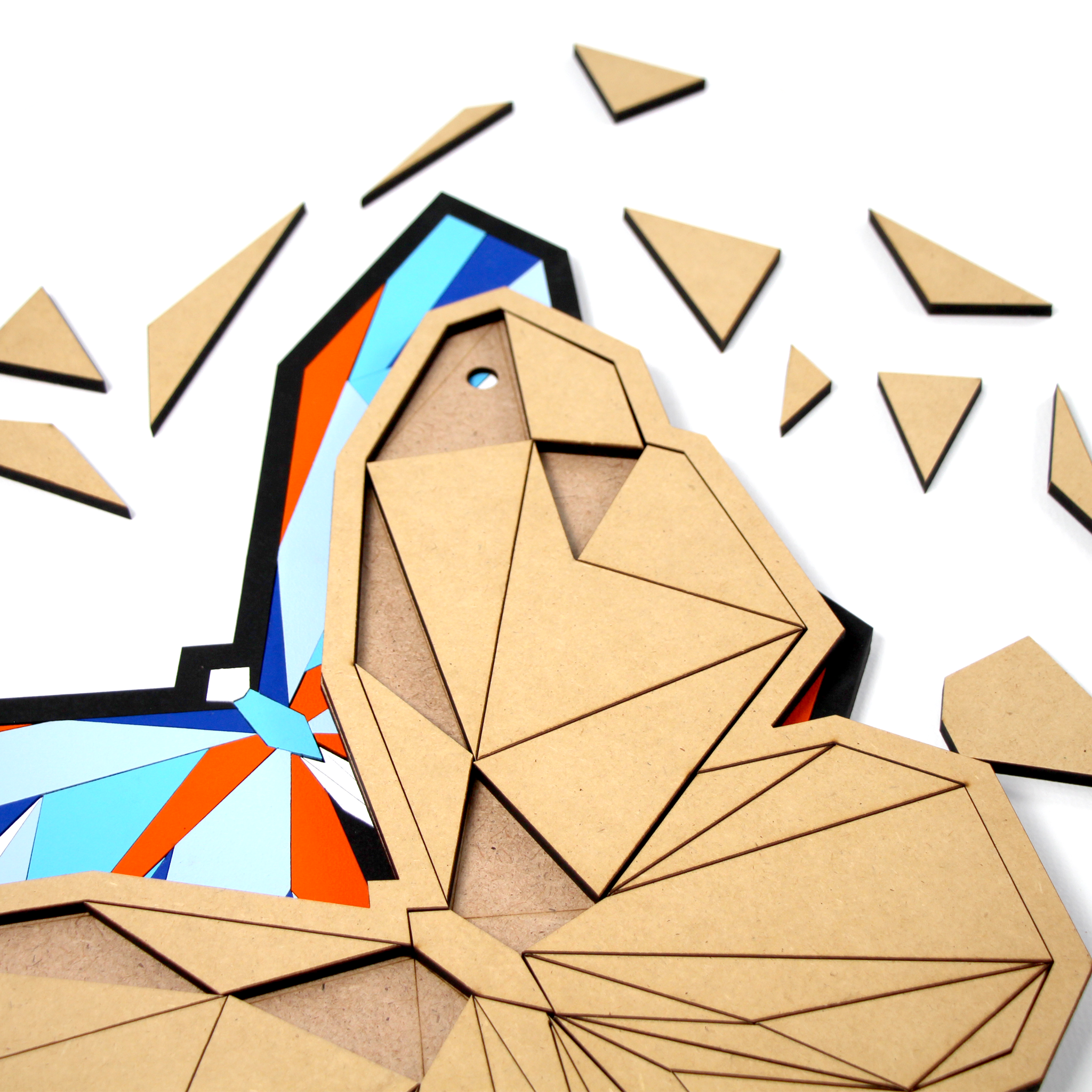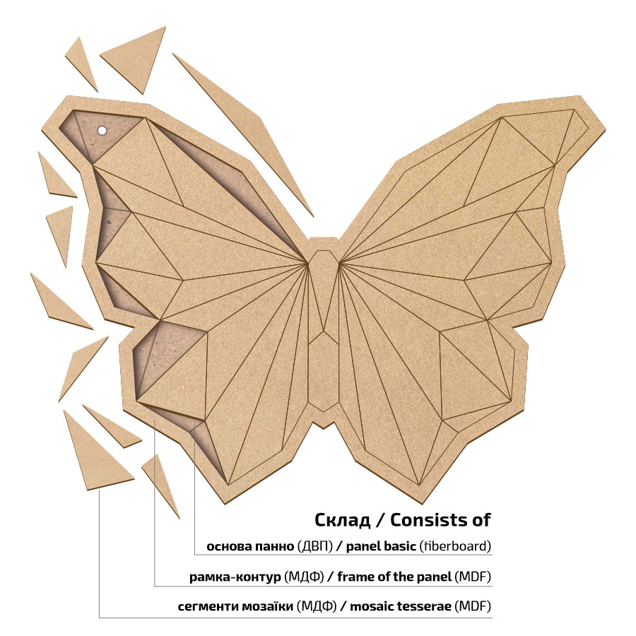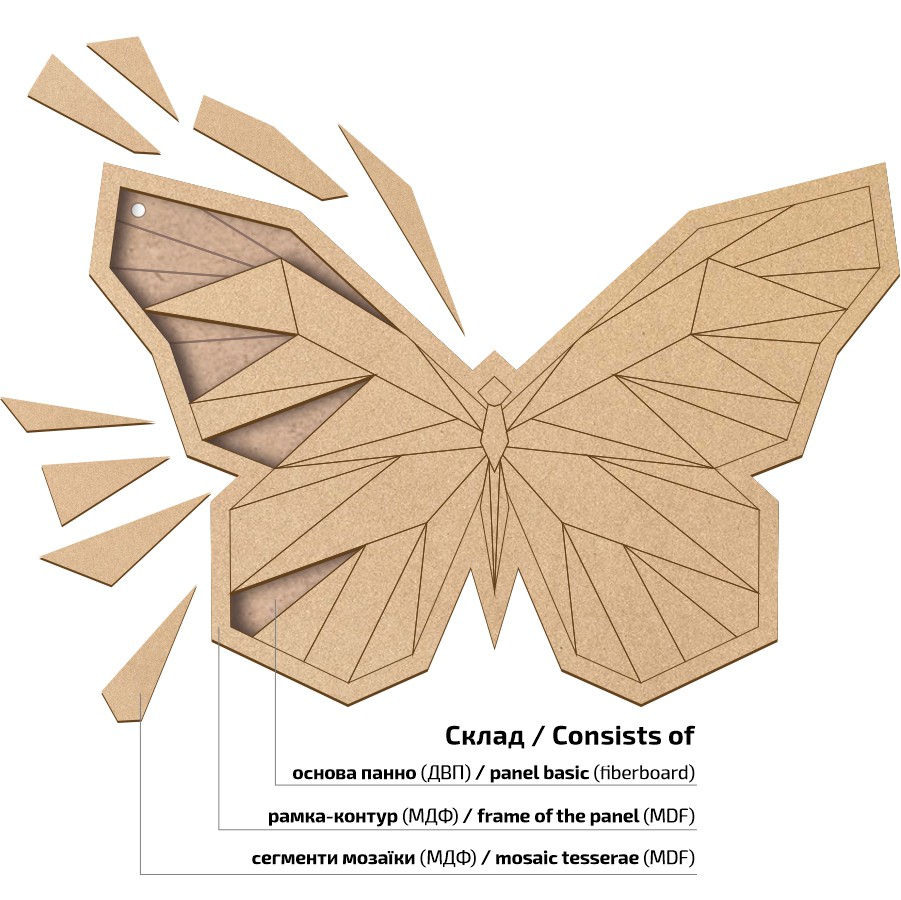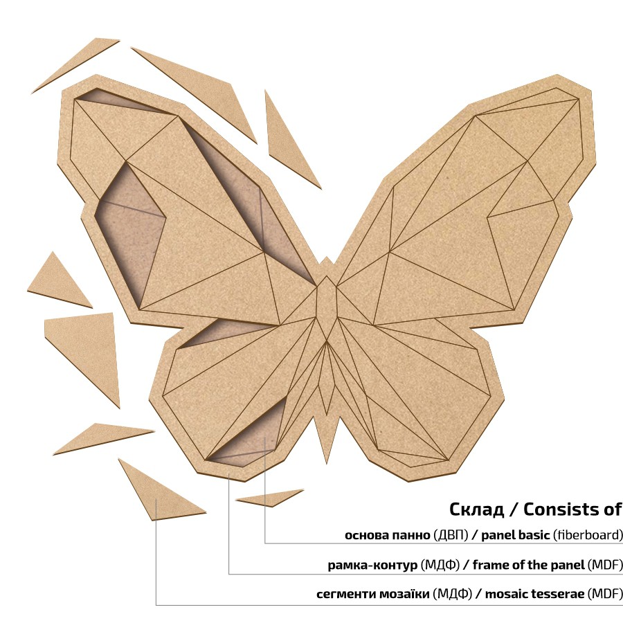 Кожне панно складається з основи з ДВП, рамки та геометричних елементів з МДФ, які легко та просто розфарбувати та скласти, адже на основі заготовки нанесені контури підказки.