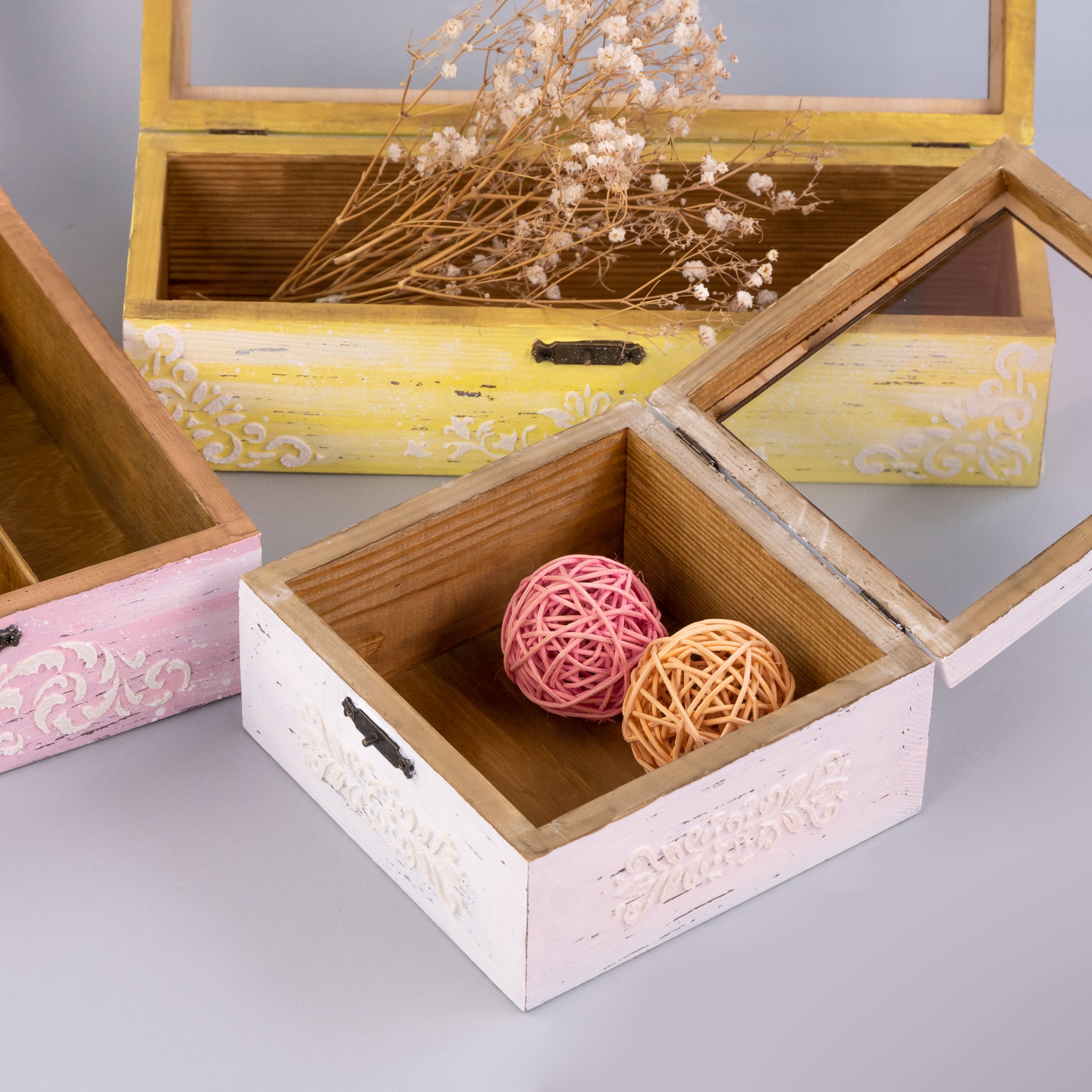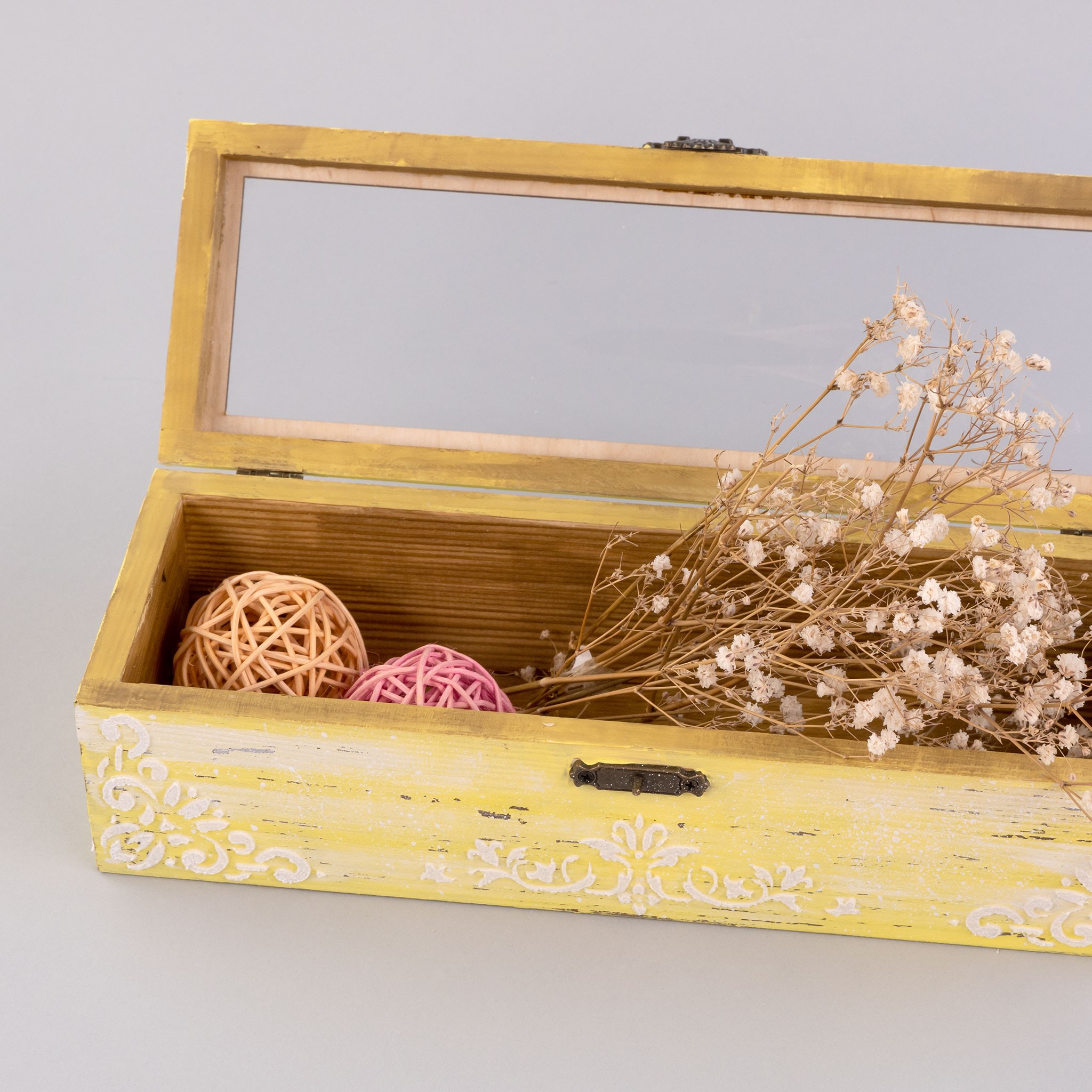 • Прозора кришка (плівка) при оформленні подарунка чи використанні в інтер’єрі дозволяє бачити вміст скриньки;