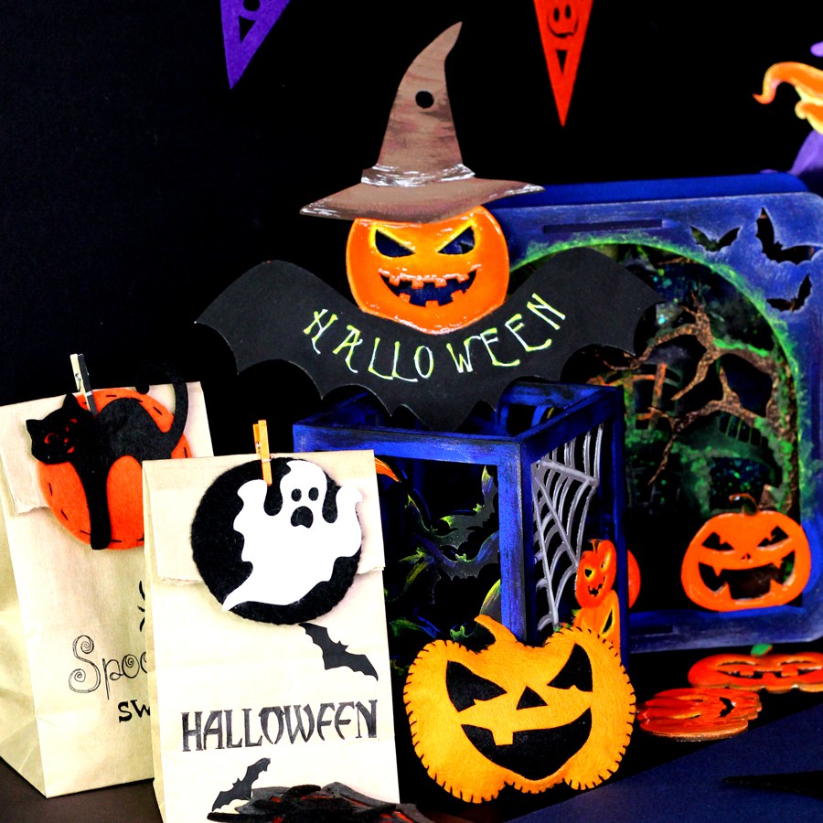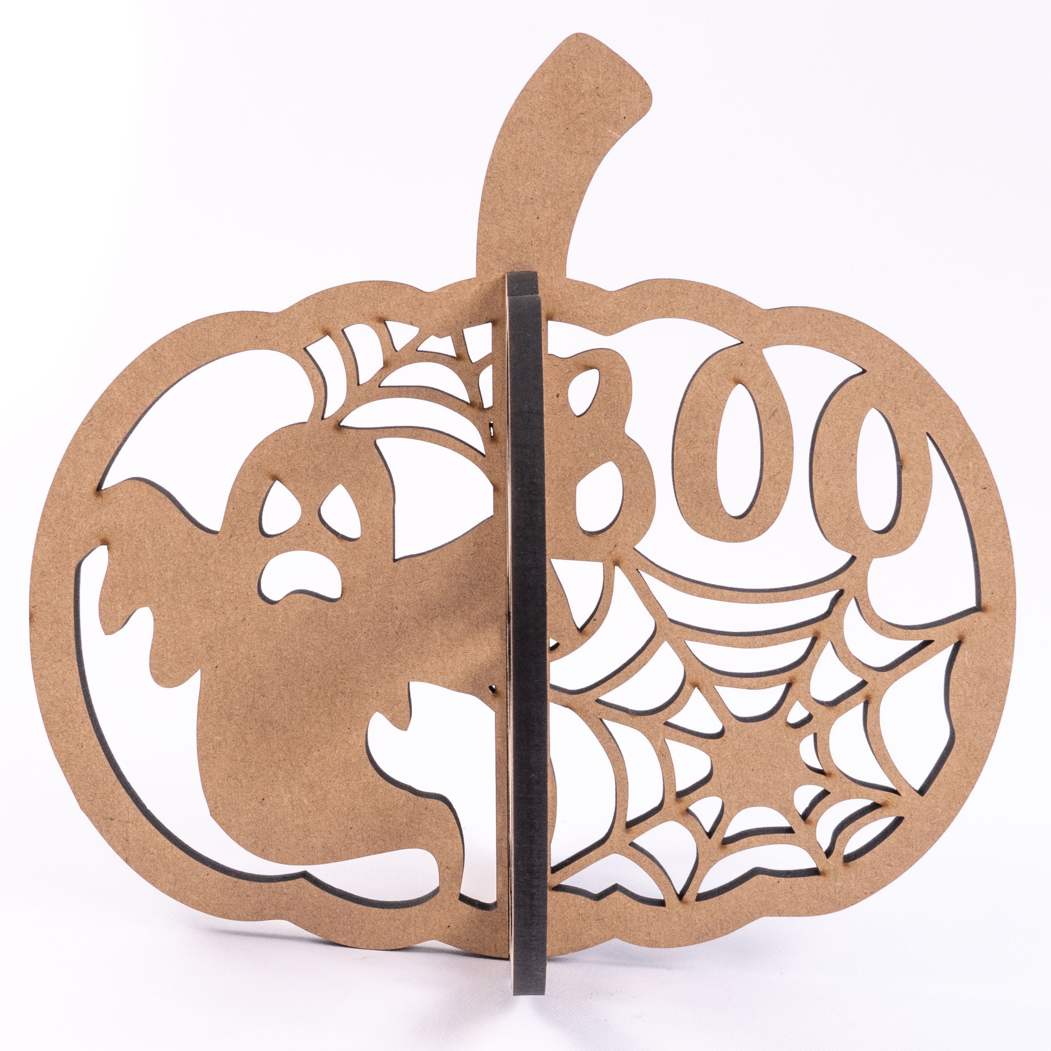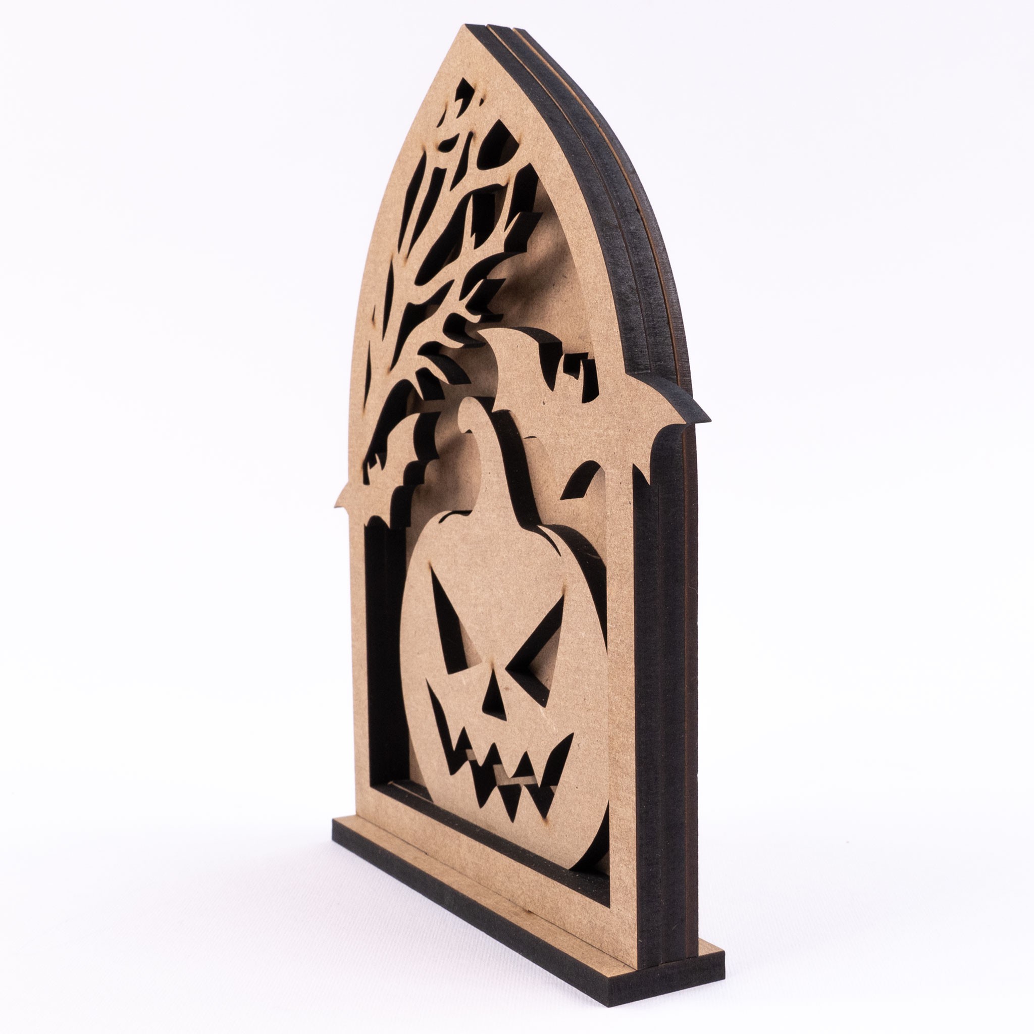Заготовки для декору із фанери, МДФ і ДВП: будиночок для цукерок, декоративні стакани, які можна використовувати як підсвічники, декоративні написи, підвісні панно, 3D композиції, набори гарбузів та ключів. Оформіть вікна тематичними фігурками кажанів, привидів, павуків – у вечірньому освітленні вони виглядатимуть дуже атмосферно!
