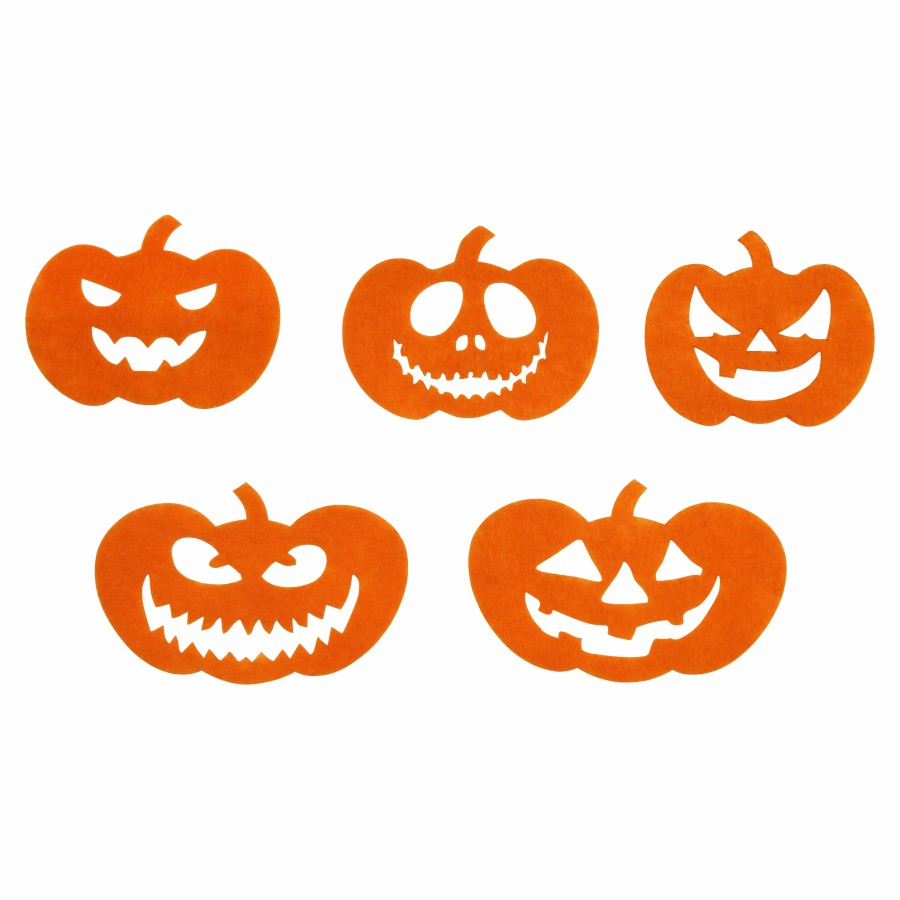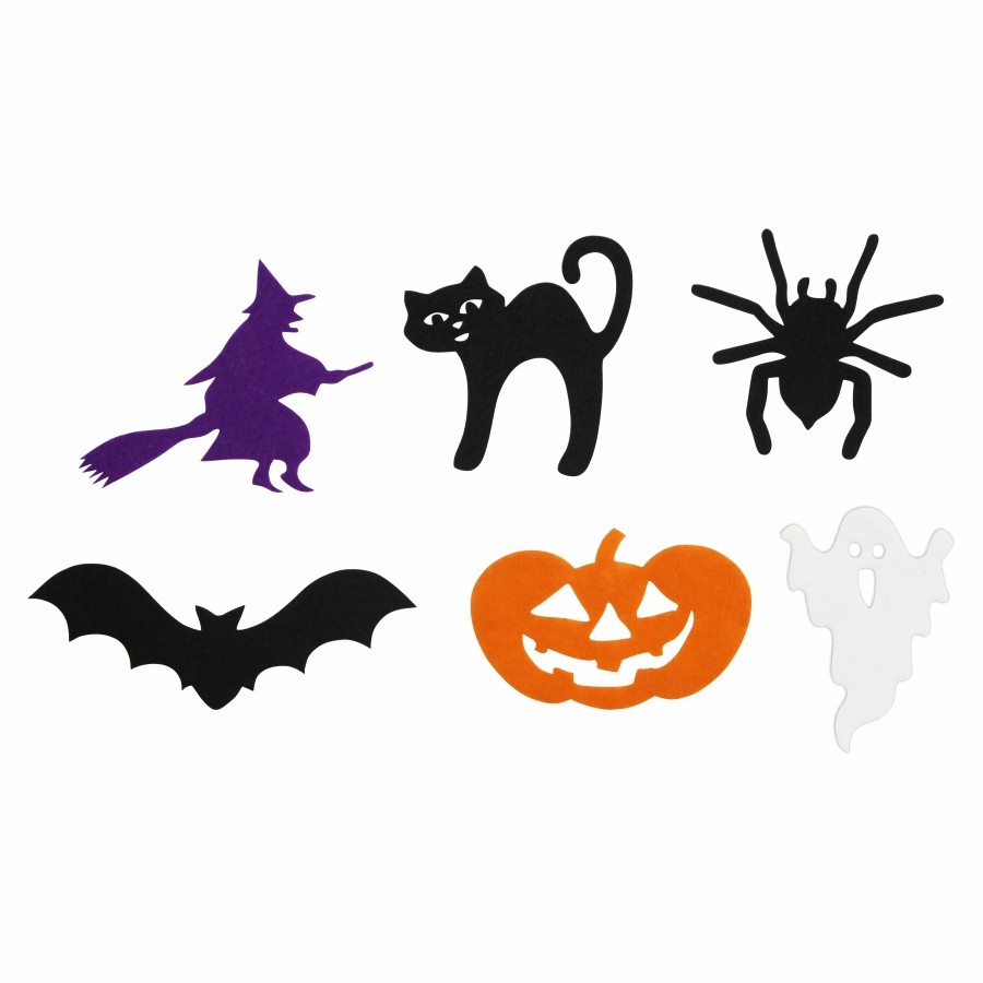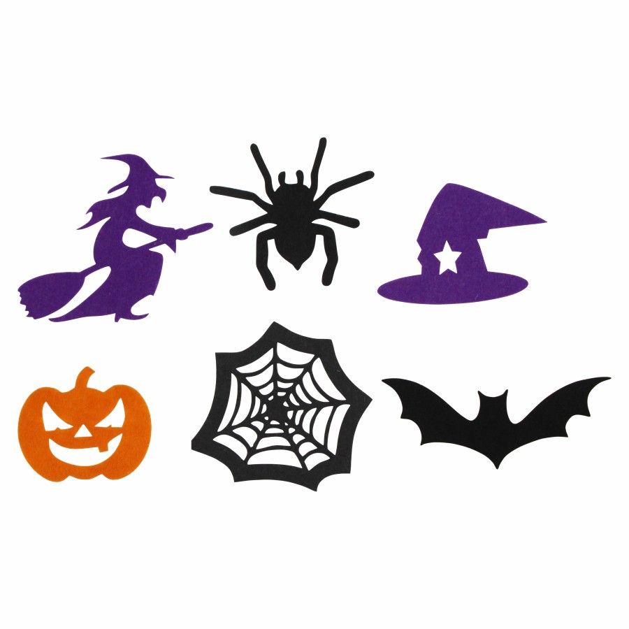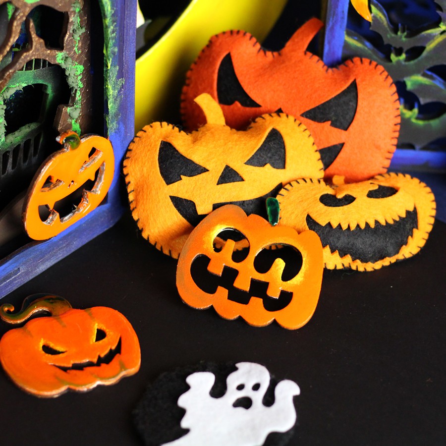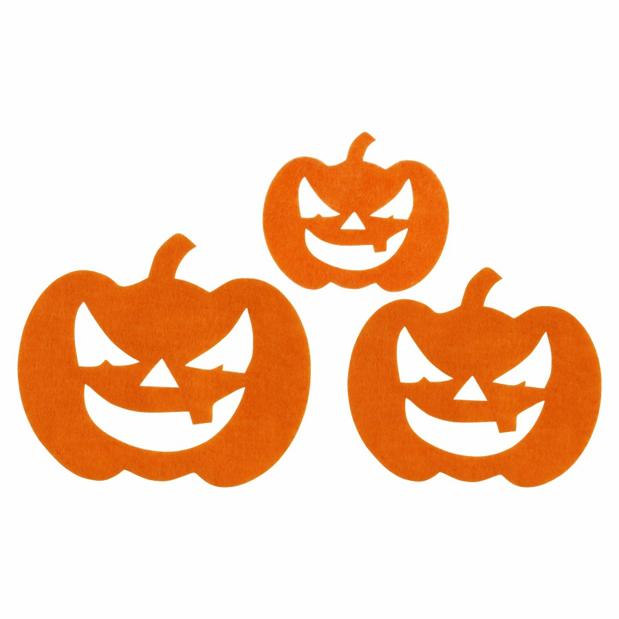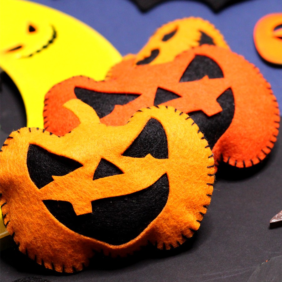 Декоративні елементи з фетру: гарбузи, привиди, павуки, кажани, відьми, можна використовувати як аплікації або нашивки, для оформлення листівок ручної роботи, подарункових упаковок, композицій, іграшок, для декору сумок та головних уборів, створення тематичних гірлянд. Фетрові заготовки є відмінним матеріалом для розвитку дитячої творчості – він приємний на дотик, не мнеться і легкий у роботі.