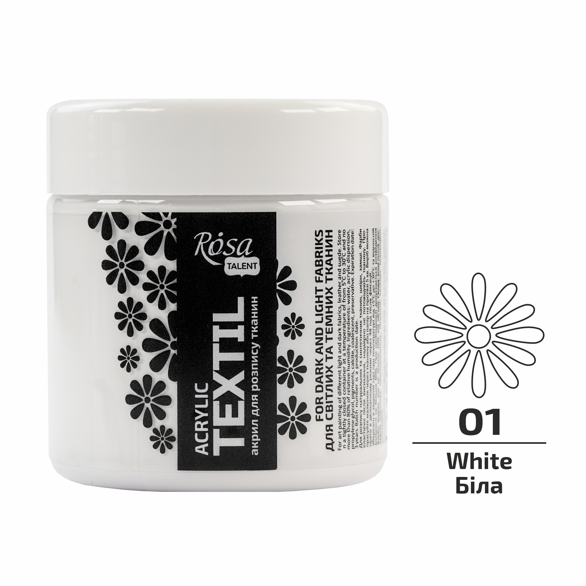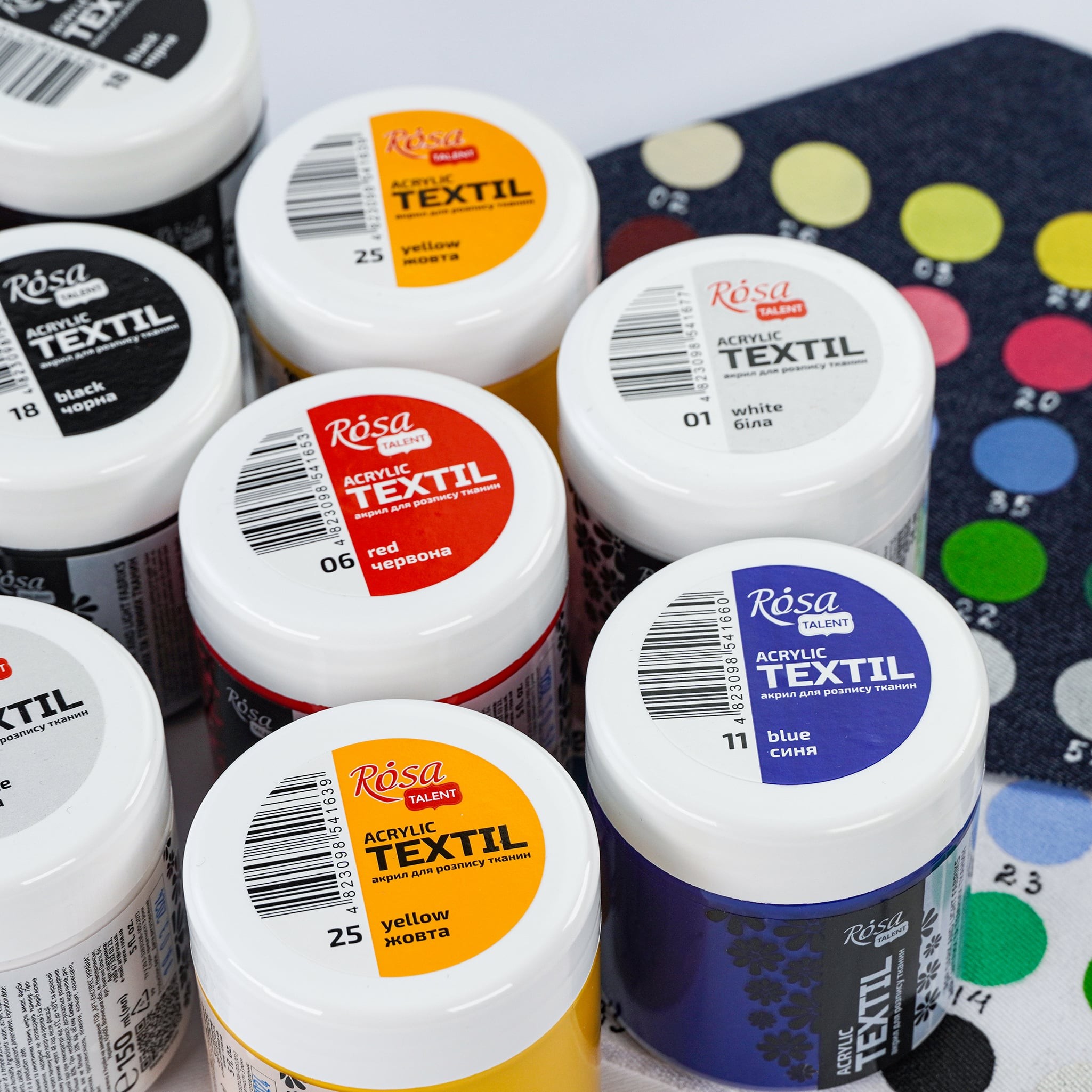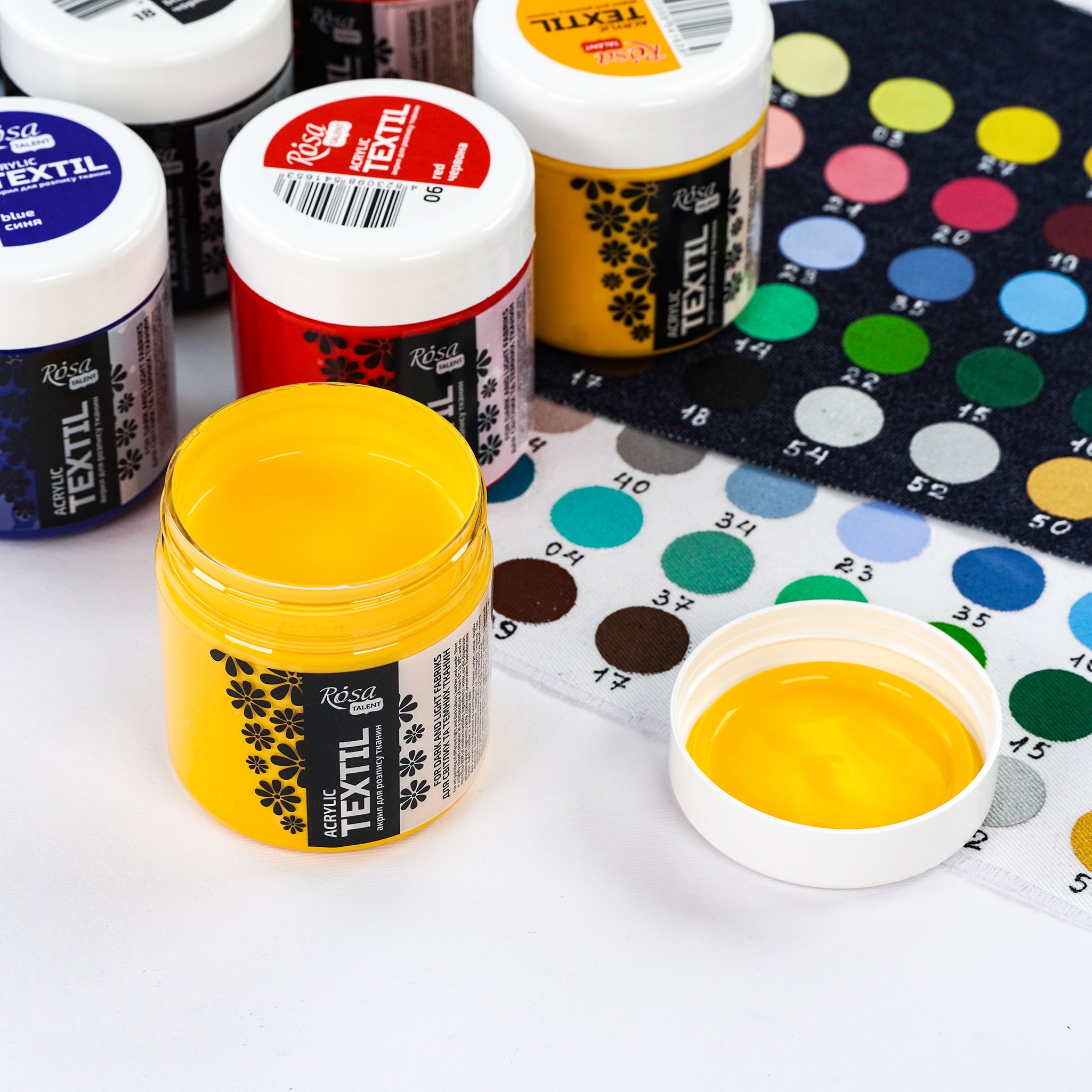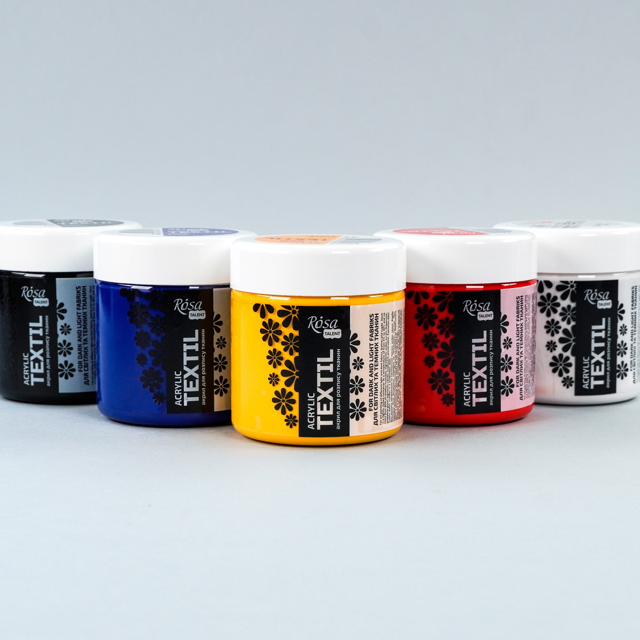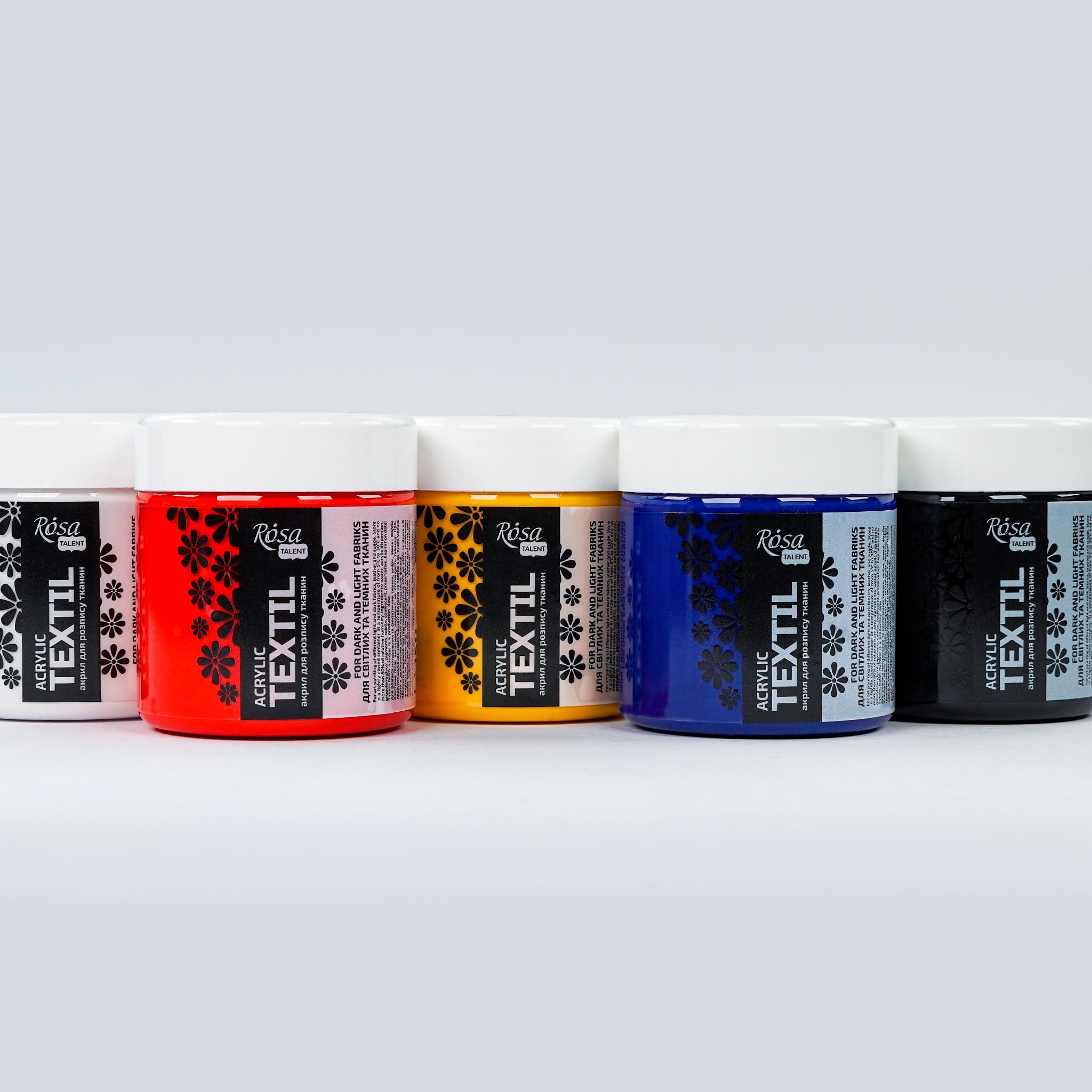 5 основних кольорів акрилових фарб по тканині ROSA TALENT в великому об’ємі чудово підійдуть для: