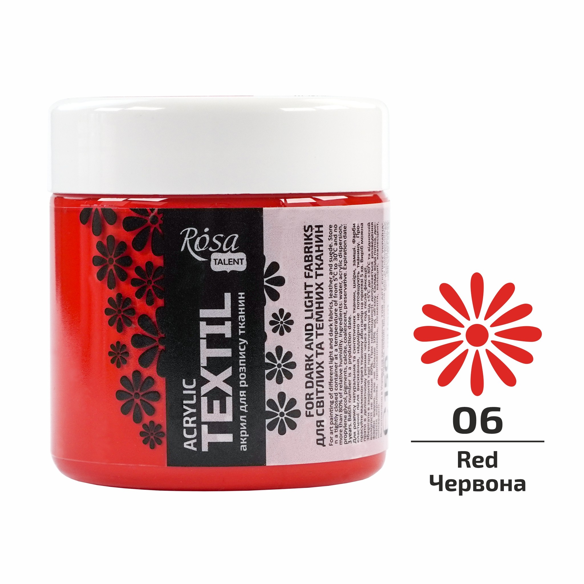 Акрилові фарби по тканині ROSA TALENT є високопокривними, внаслідок цього будь-який колір виглядає насиченим, як на світлій, так і на темній тканині. Якщо потрібно досягти ефекту «прозорості» фарбу потрібно розвести водою.
