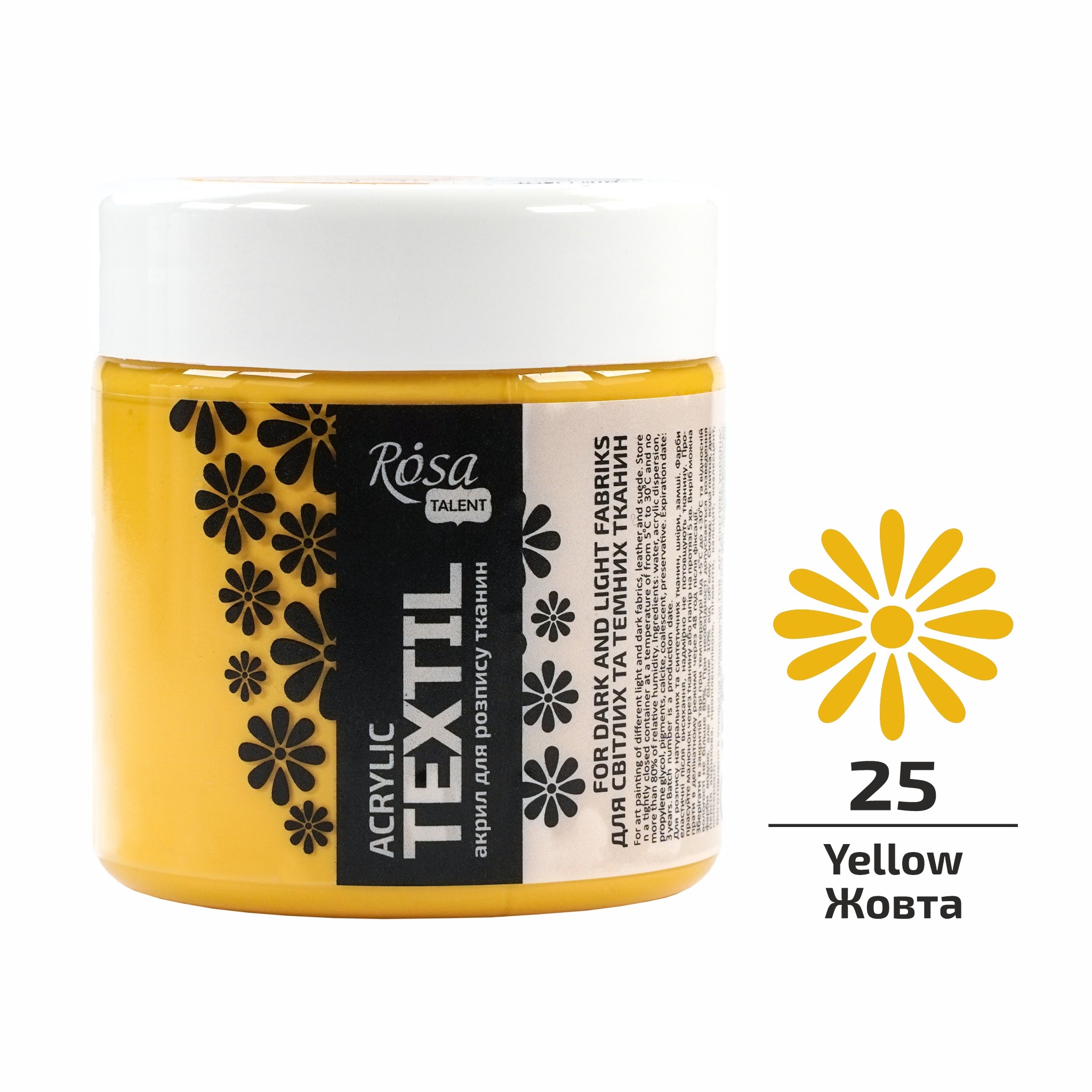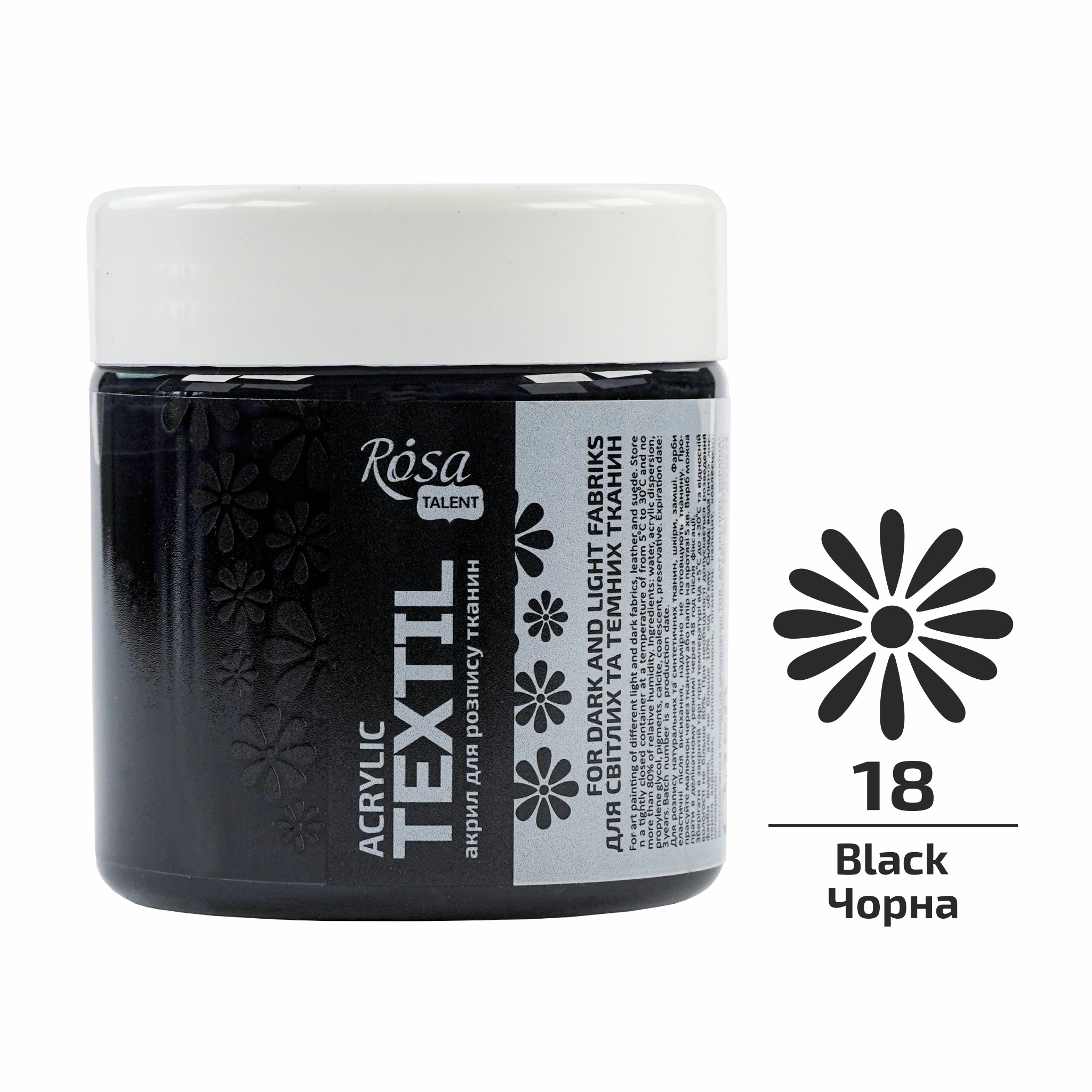Палітра акрилових фарб по тканині ROSA TALENT складається з 5 базових кольорів в банках об’ємом 150 мл, 40 матових кольорів в об’ємі 20, 60, 80 мл; 2 металіки в тубі 60 мл; 2 металіки, 1 перламутр, 4 флуорисцентні кольори об’ємом 20 мл, а також доступні набори на 6, 9, 12, 18 та 24 кольори по 20 мл. Обирайте кольори та об’єми відповідно до Ваших потреб та способів використання!