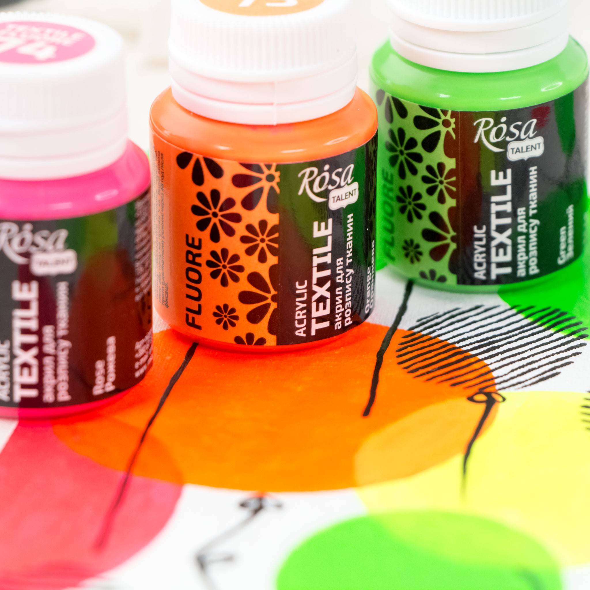 Флуорисцентні кольори чудово змішується з усіма кольорами акрилу для розпису тканин ROSA Talent. Висока концентрація пігменту у фарбі забезпечує насичені, яскраві, чисті кольори після нанесення та високий рівень флуоресцентності. Особливо стильно та контрастно розпис такими кольорами виглядає на чорних тканинах.