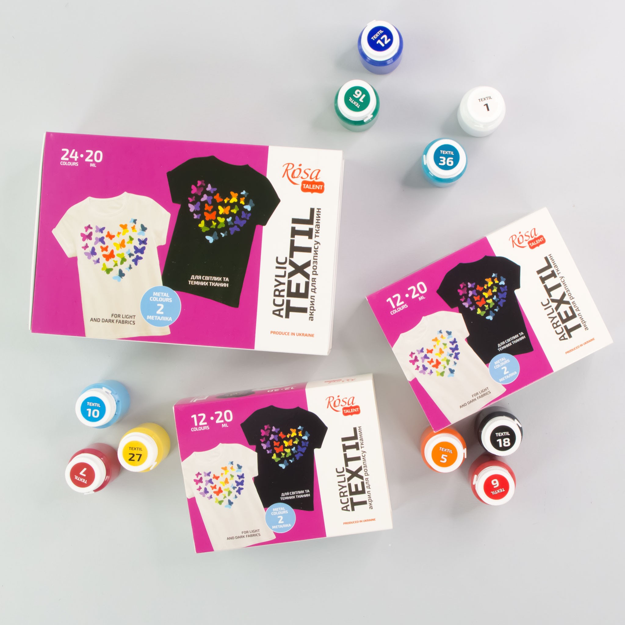 Акрилові фарби по тканині ROSA Talent на водній основі ідеальні для розпису світлих та темних тканин різного складу, в тому числі шкіри і замші. Вони еластичні після висихання та надмірно не потовщують тканину. Яскраві та насичені кольори фарб добре змішуються між собою, утворюючи нові бажані відтінки. Завдяки однорідній консистенції фарби рівномірно лягають на тканину та не розтікаються, тому їх зручно наносити через трафарет.