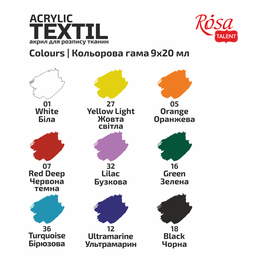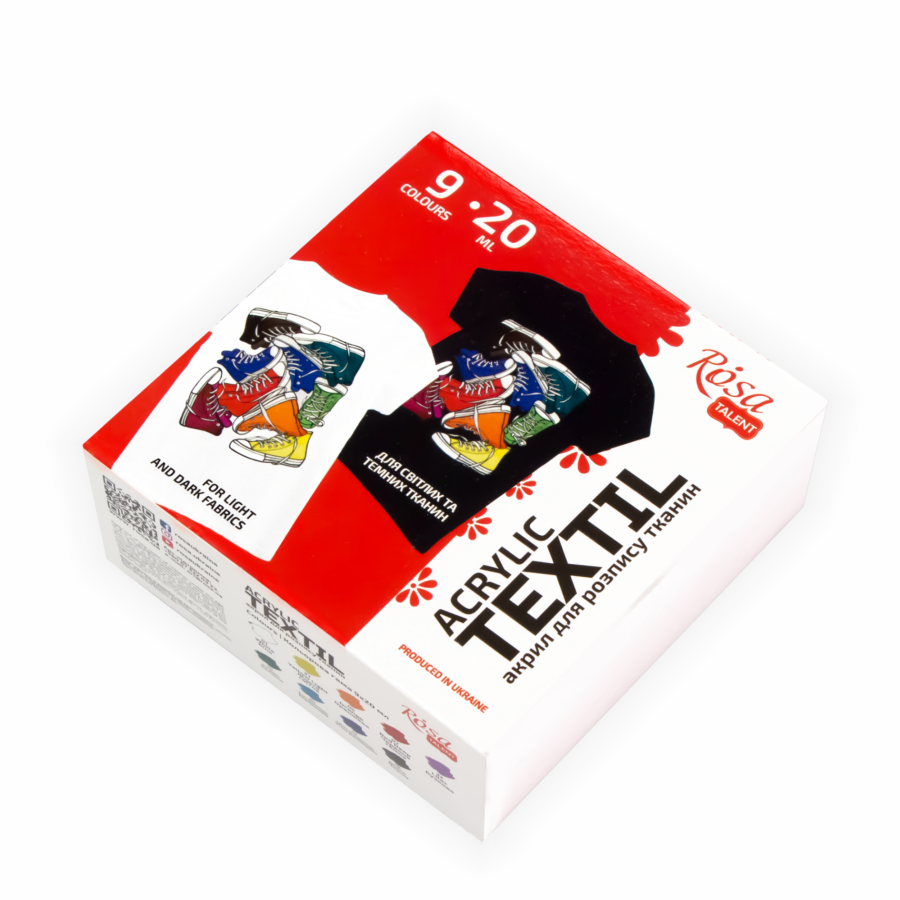 Акрилові фарби по тканині ROSA Talent на водній основі ідеальні для розпису світлих та темних тканин різного складу, в тому числі шкіри і замші. Вони еластичні після висихання та надмірно не потовщують тканину. Яскраві та насичені кольори фарб добре змішуються між собою, утворюючи нові бажані відтінки. Завдяки однорідній консистенції фарби рівномірно лягають на тканину та не розтікаються, тому їх зручно наносити через трафарет.