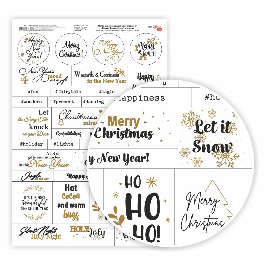 Тематичні вислови та побажання в новорічно-різдвяній тематиці на трьох мовах, поєднання чорного шрифту з золотом та сріблом, різні форми вирізок та шрифтів – дозволять акуратно та стильно підписати свій виріб з мінімальною затратою часу!